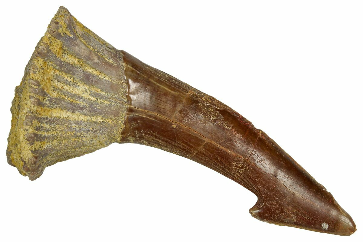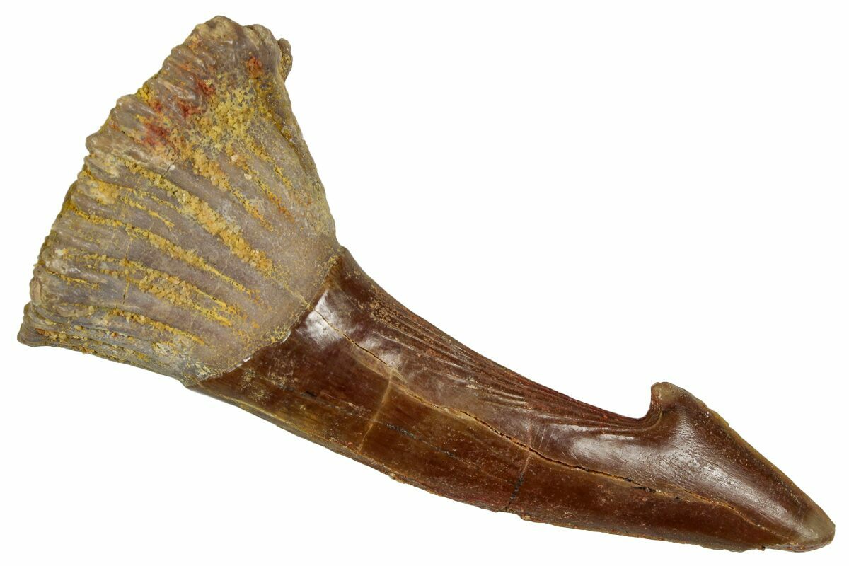 This is a 2.5" long rostral barb/tooth from an extinct, giant sawfish (Onchopristis numidus). It was collected from the Kem Kem Beds in Taouz, Morocco.
