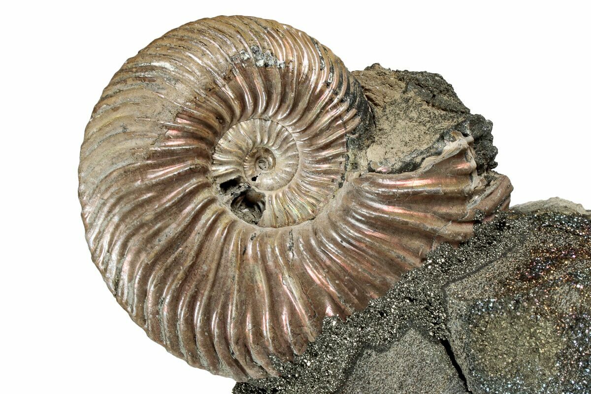 This is an interesting and colorful pyritized ammonite (Quenstedticeras sp.) display. The ammonite was collected from the Middle Jurassic age deposits along the banks of the Volga River near Saratov, Russia. It has been mounted to this section of iridescent pyrite ("rainbow pyrite") encrusted rock to create this alluring display.