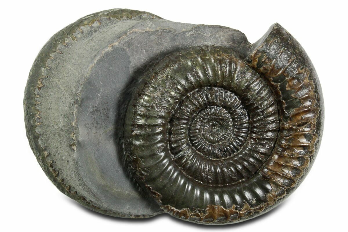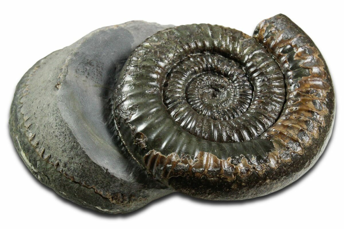 This is a classic British ammonite of the species Dactylioceras commune. These well preserved ammonites are Jurassic in age and are found in hard concretions that must be split open to reveal the fossil. The hard rock then has to be removed mechanically to further expose the fossil.