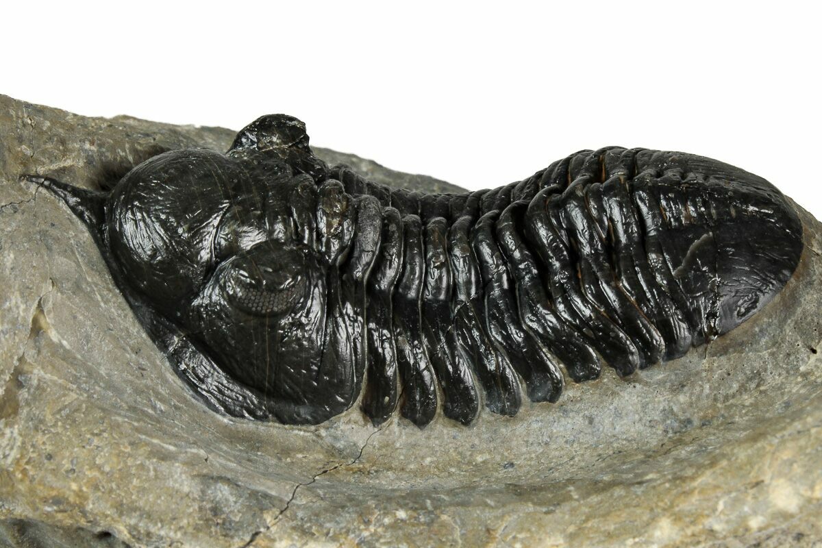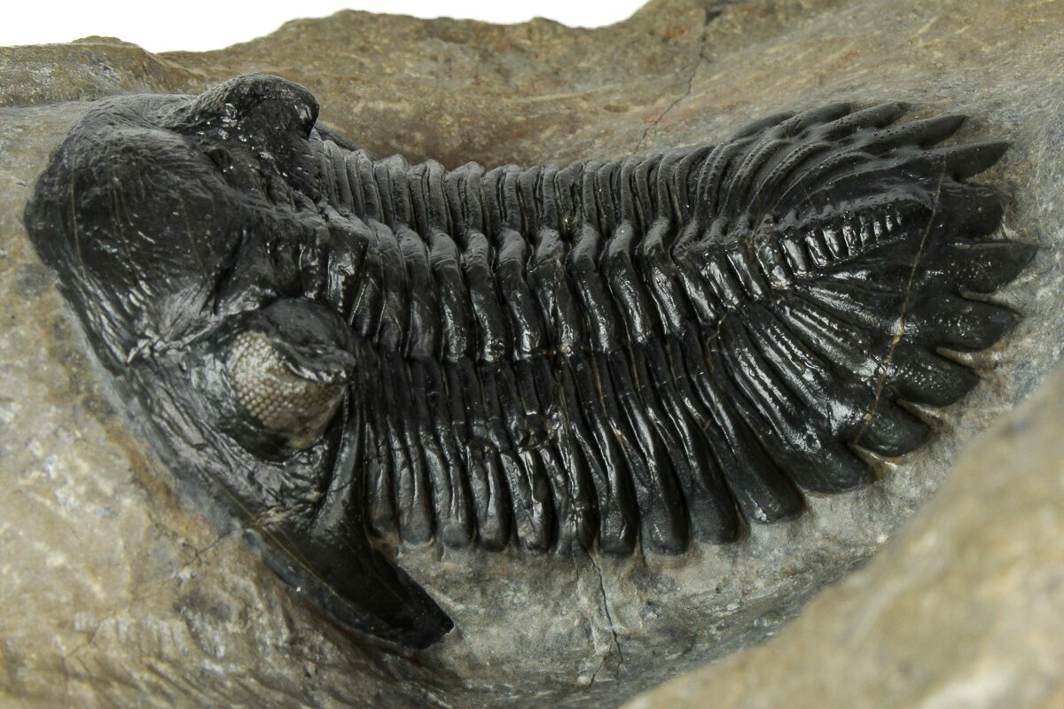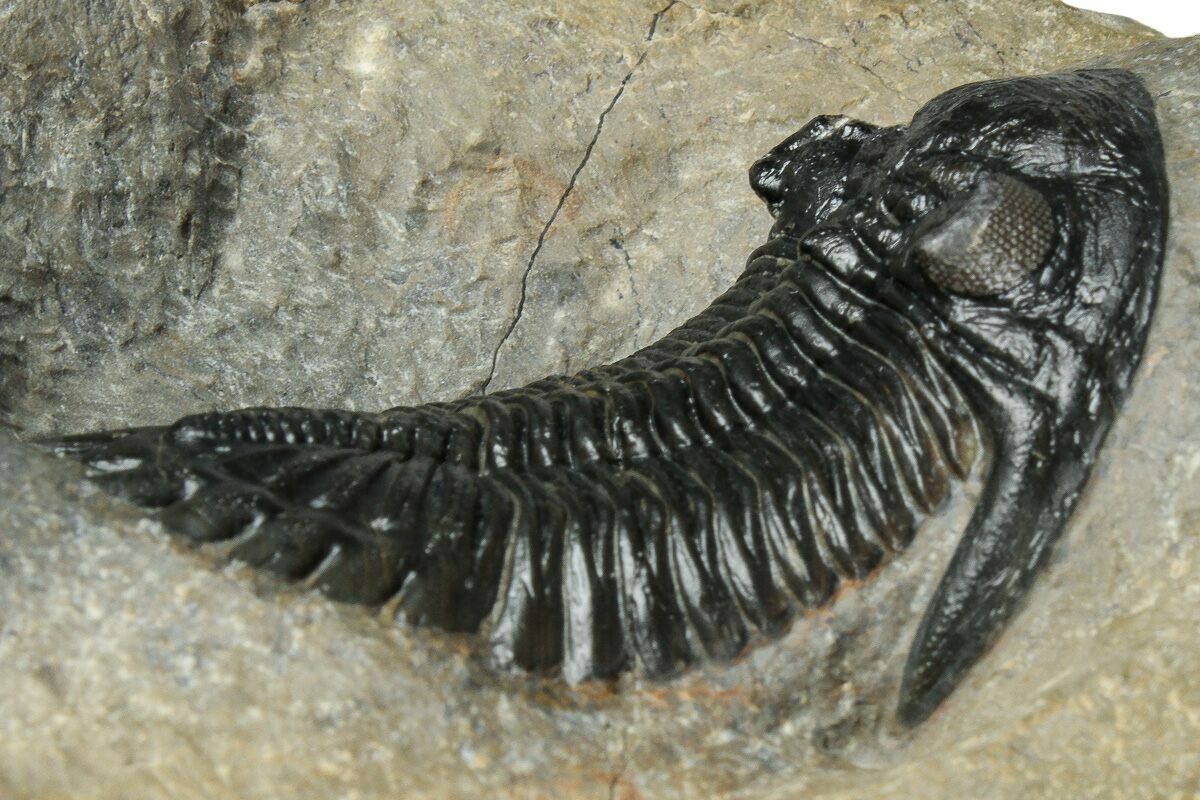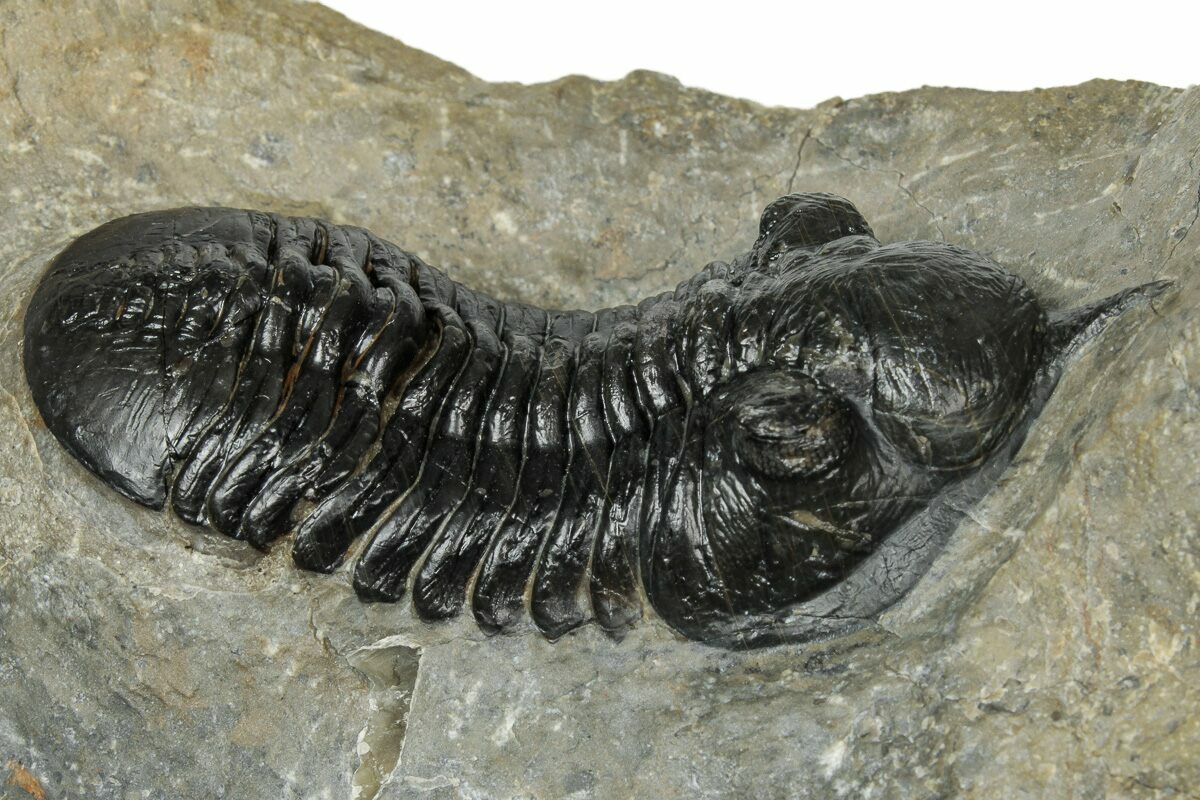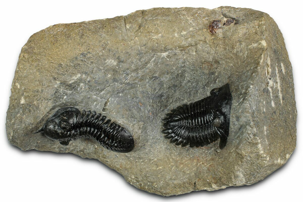 This is a fantastic, natural association of a 2.7" long Morocconites malladoides trilobite along with a 2.5" Hollardops from the Tazoulait Formation of Morocco. Both trilobites are outstretched and nicely prepared. Visible eye facets in both specimens with just about 1% shell restoration along repaired cracks.