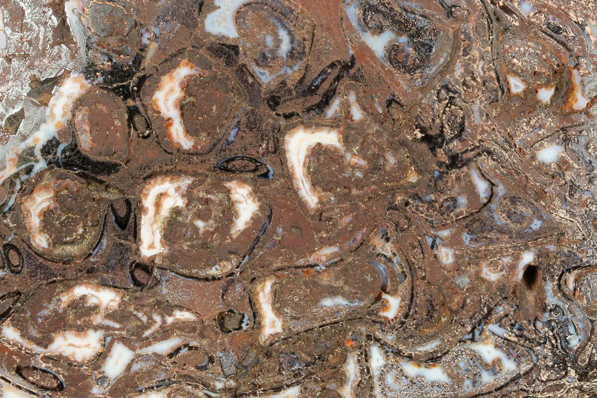 This is a 2.5" wide, polished slab of a very interesting Upper Permian aged, petrified tree fern (Paleoosmunda) from Queensland, Australia. It has a interesting coloration and is partially replaced by iron based minerals making the piece deceptively heavy.