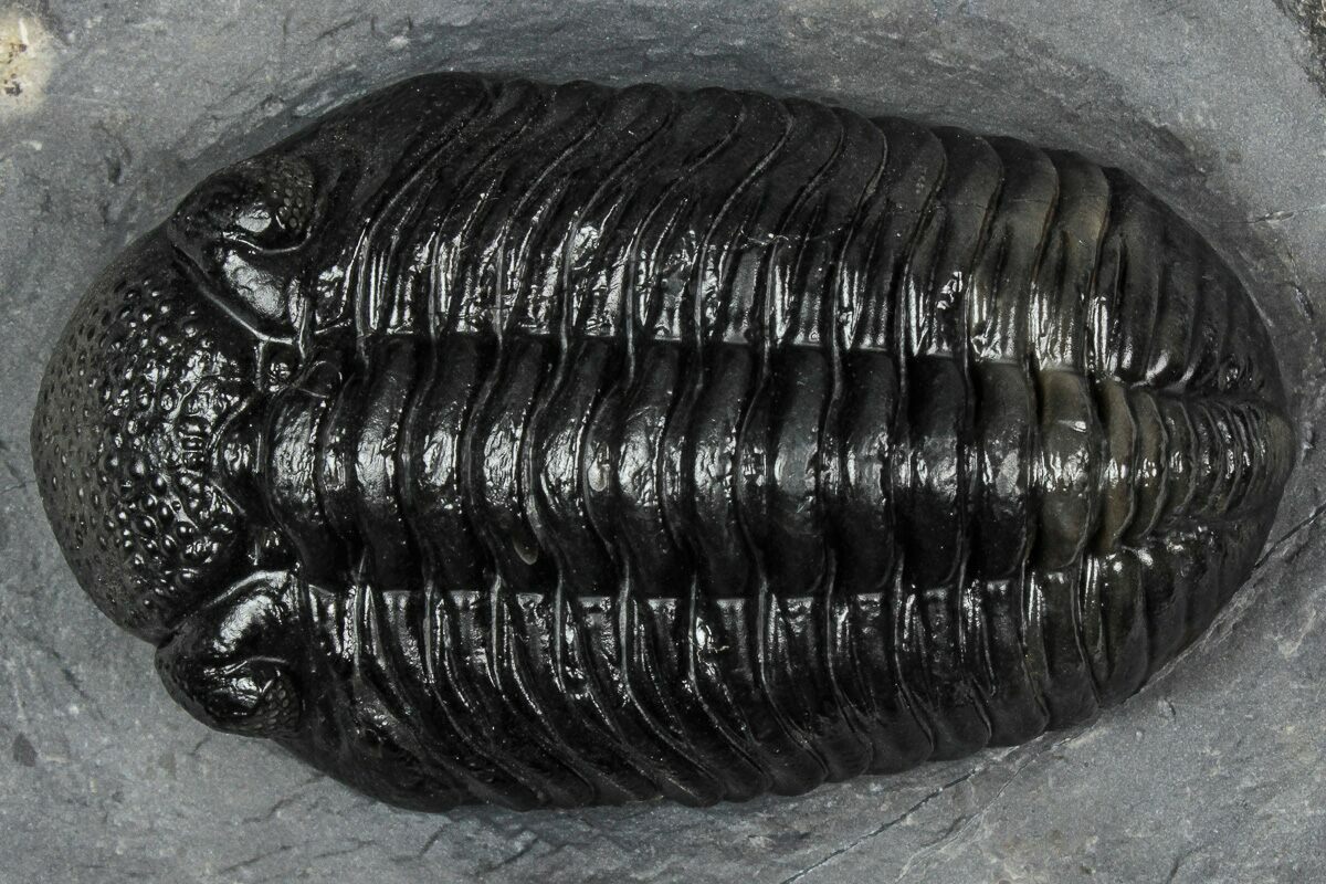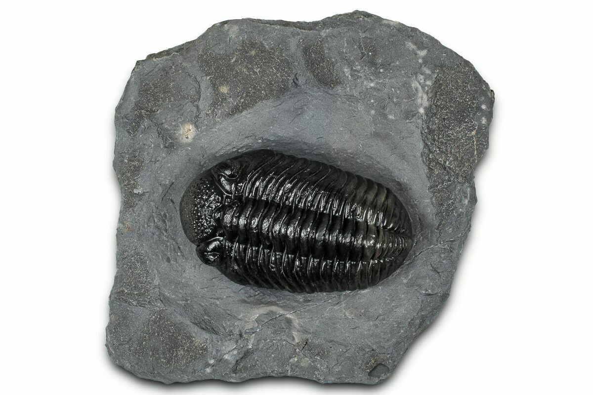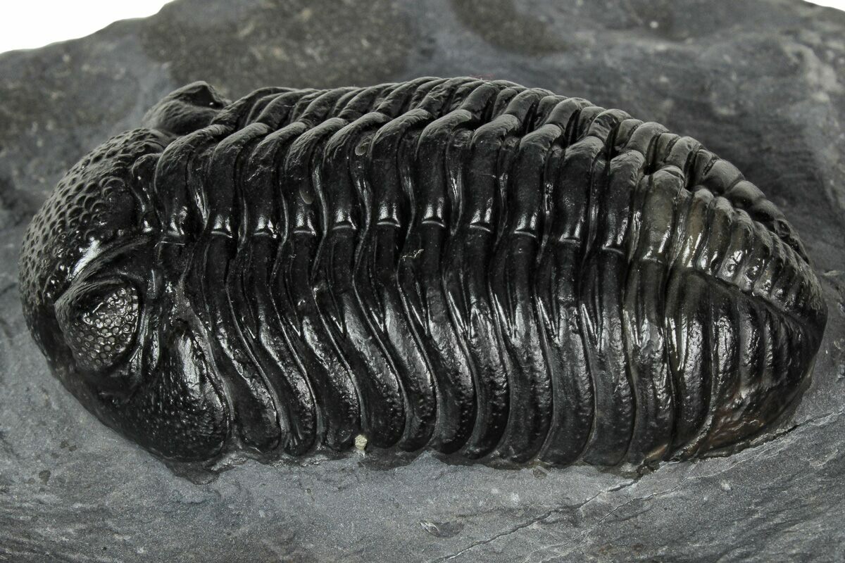 This is a nice 2.5" long prone phacopid (Pedinopariops vagabundus) trilobite from Mrakib, Morocco. It has excellent eye facet detail in both eyes.