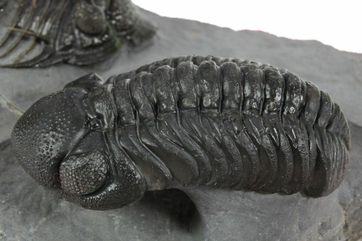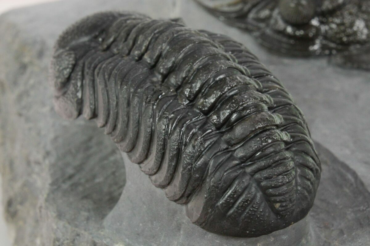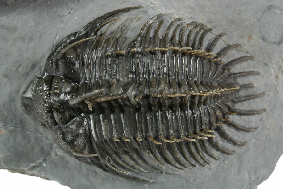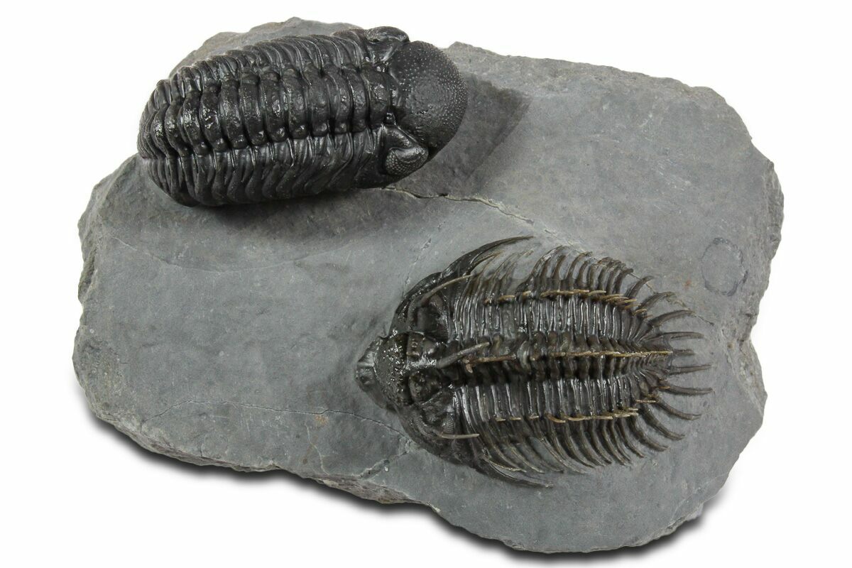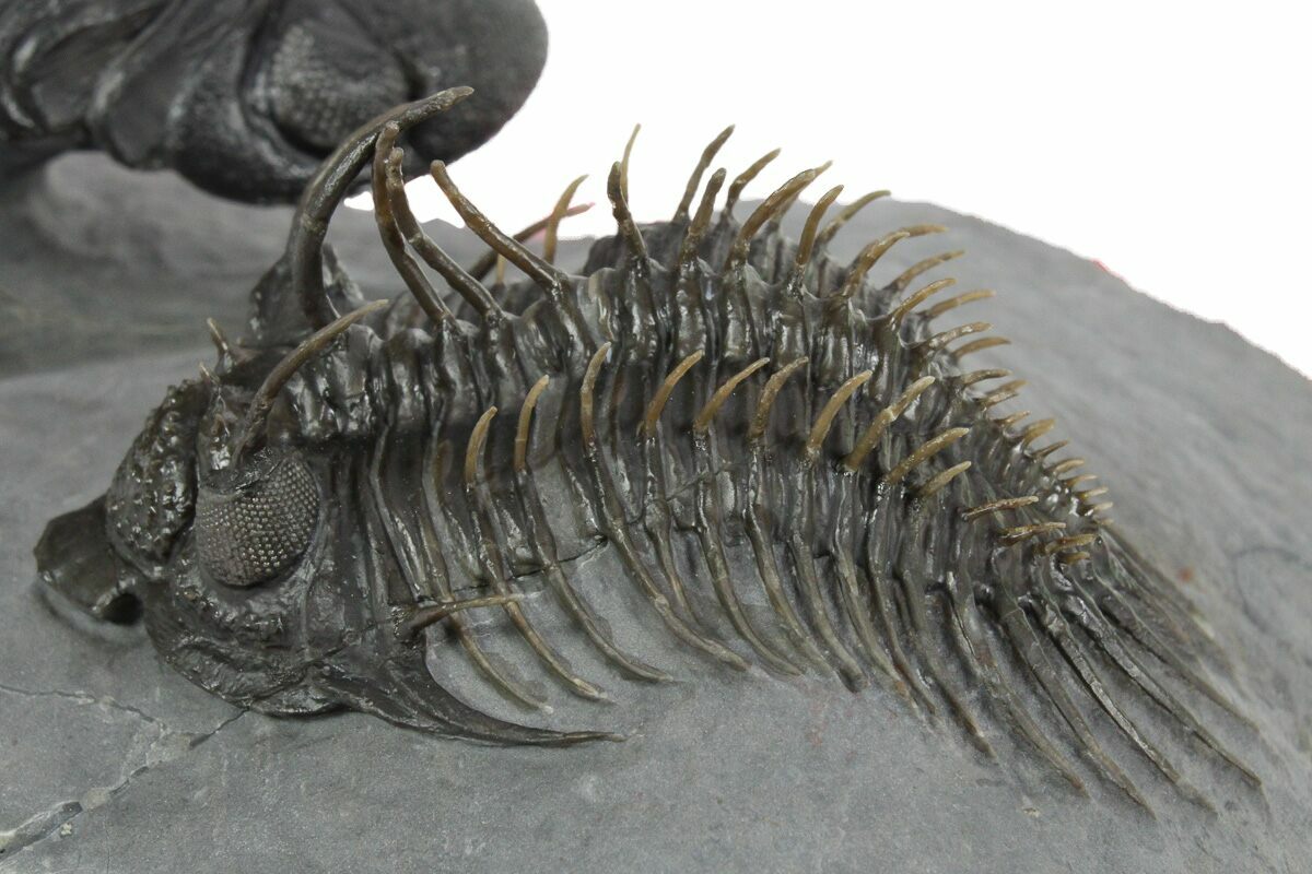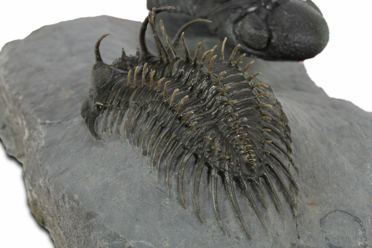 This is an exceptional association of a spiny, Comura bultyncki trilobite along with an Austerops from the Tazoulait Formation at Ofaten, Morocco. The preparation is amazing on this piece, and the Comura has around 40 free standing spines. There is aobut 3% shell restoration on the Auserops but none on the Comura.