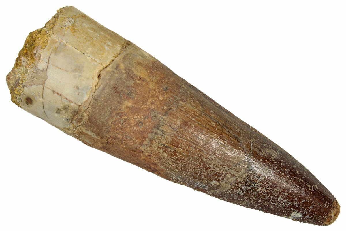 This is a 2.51" long Spinosaurus tooth from the Kem Kem Beds of Morocco. It is Late Cretaceous in age, approximately 95 million years old.