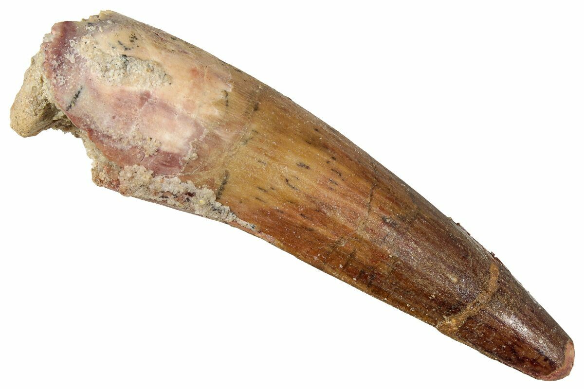 This is a 2.51" long Spinosaurus tooth from the Kem Kem Beds of Morocco. It is Late Cretaceous in age, approximately 95 million years old.