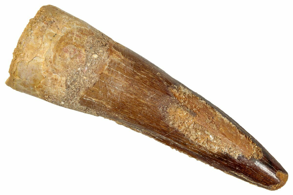 This is a 2.51" long Spinosaurus tooth from the Kem Kem Beds of Morocco. It is Late Cretaceous in age, approximately 95 million years old.