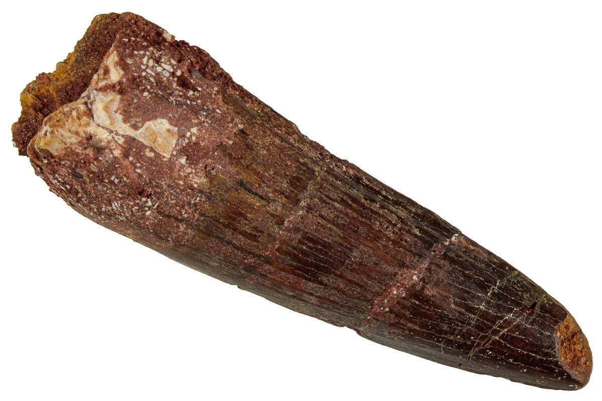 This is a 2.52" long Spinosaurus tooth from the Kem Kem Beds of Morocco. It is Late Cretaceous in age, approximately 95 million years old.
