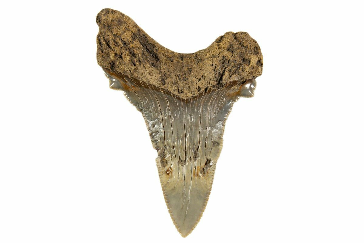 This is a serrated, 2.520" long fossil Otodus angustidens shark tooth. Angustidens is believed to be an ancestor of the fearsome megalodon shark, though it did not grow nearly as large.