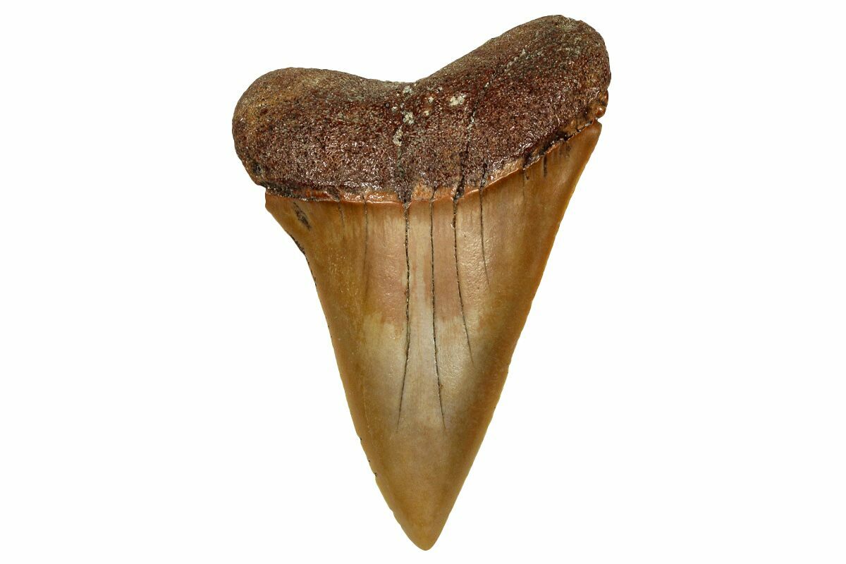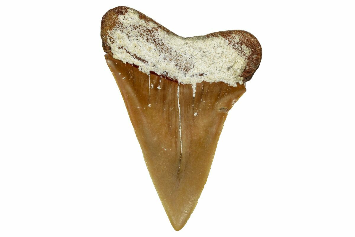 This is a 2.53" fossil tooth of Carcharodon (Cosmopolitodus) hastalis, an extinct species of large mackerel shark that cruised the oceans during the Miocene and Pliocene epochs, approximately 23 to 3.6 million years ago. This specimen was collected from the phosphate deposits near Dakhla in Western Sahara, Morocco, a region well known for producing high-quality shark teeth.