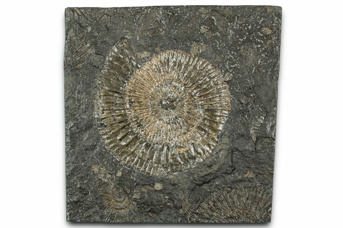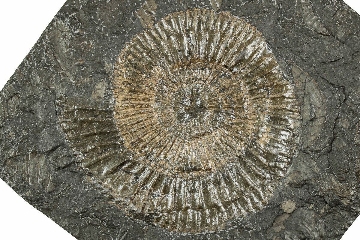 This is a 2.55" wide Dactylioceras ammonite fossil from the Posidonia Shale of Germany. Additional, partial ammonites can be seen around the rock as well. Ammonites from this location have been compressed and are preserved on a black slate in a partially pyritized state.