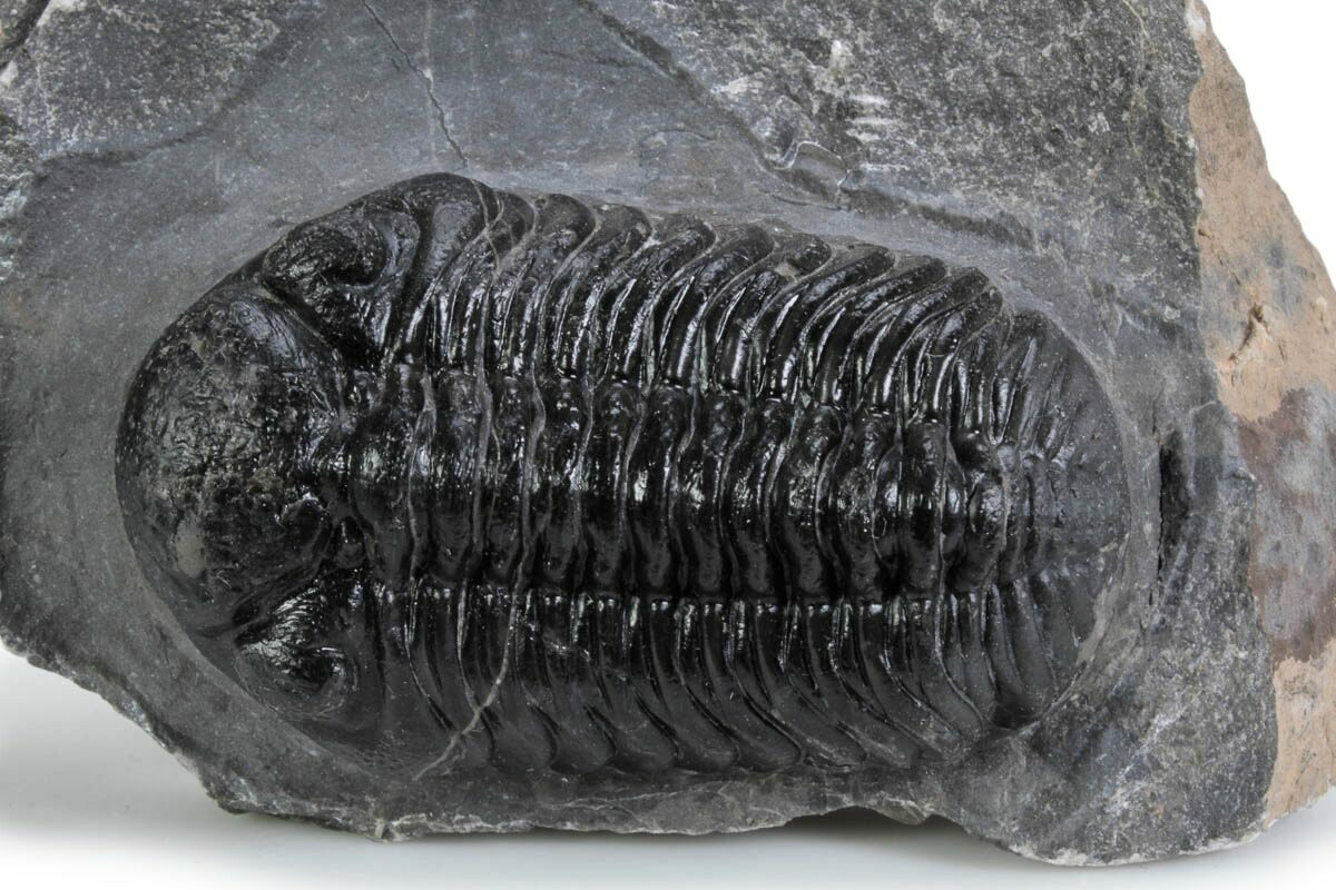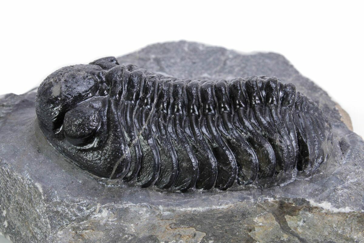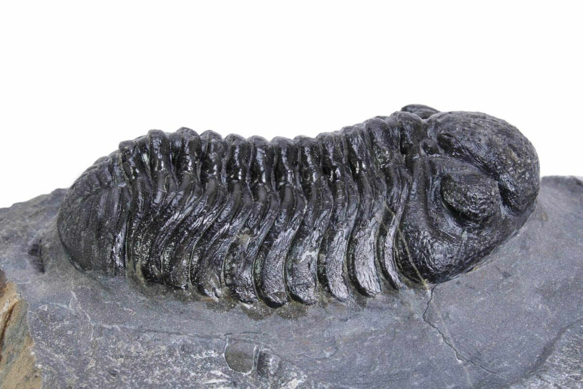 This is a detailed, 2.55" long phacopid (Pedinopariops vagabundus) trilobite from Mrakib, Morocco. It has less than 1% shell restoration along a repaired crack.