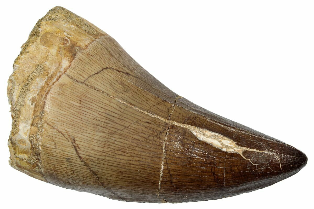 This is an enormous, 2.55" fossil mosasaur (Thalassotitan atrox) tooth from the Upper Cretaceous phosphate deposits in the Oulad Abdoun Basin of Morocco.