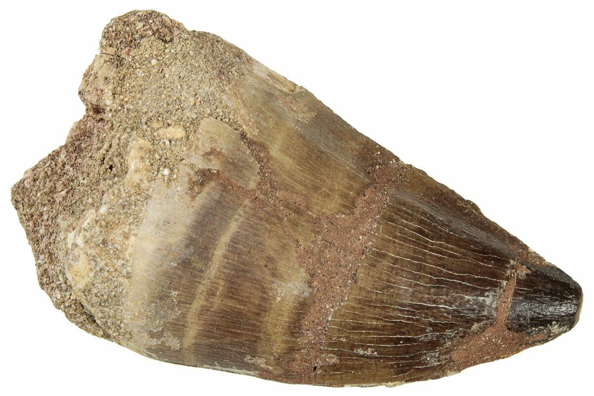 This is a 2.55" fossil mosasaur (Thalassotitan atrox) tooth from the Upper Cretaceous phosphate deposits in the Oulad Abdoun Basin of Morocco.