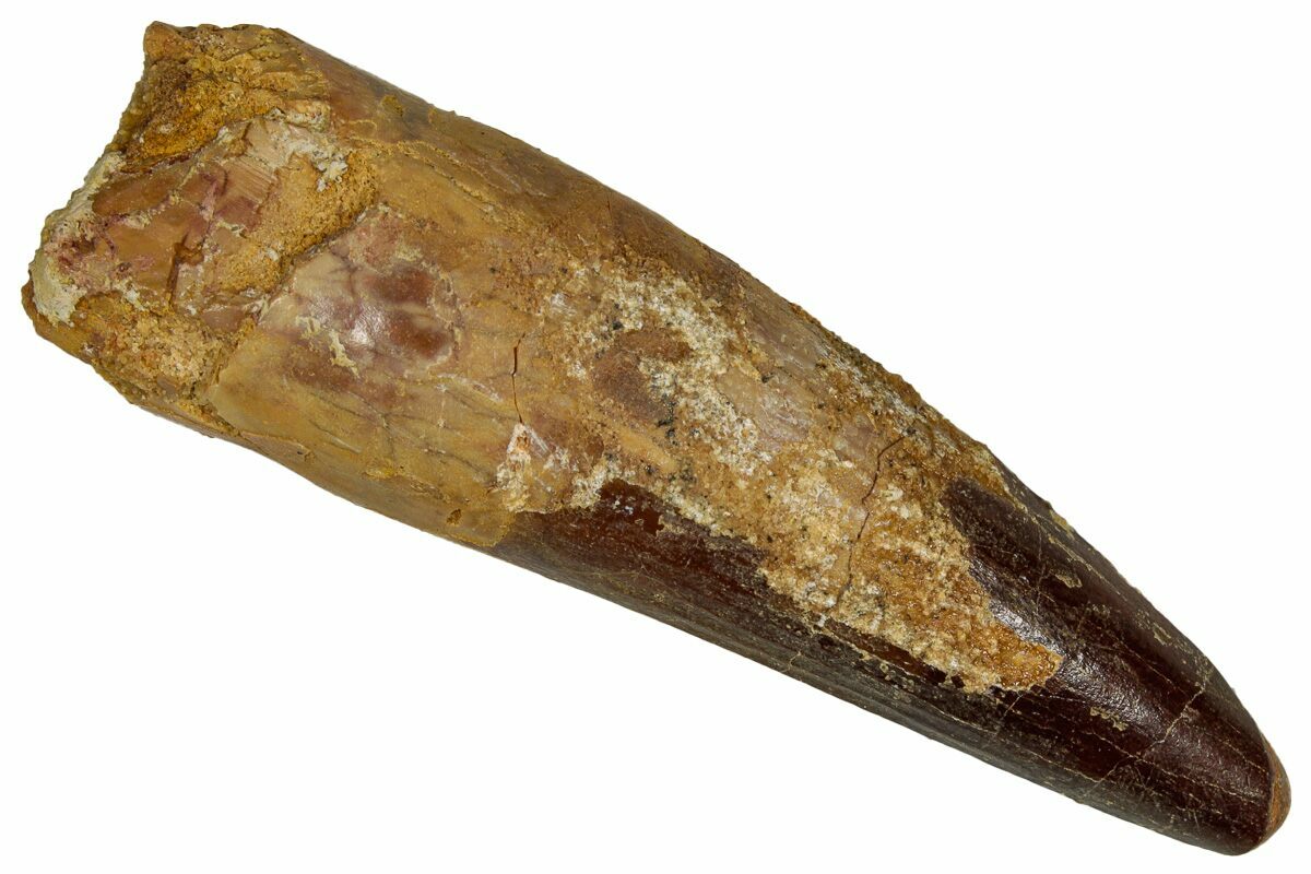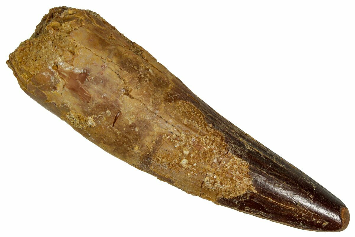This is a 2.55" long Spinosaurus tooth from the Kem Kem Beds of Morocco. It is Late Cretaceous in age, approximately 95 million years old.
