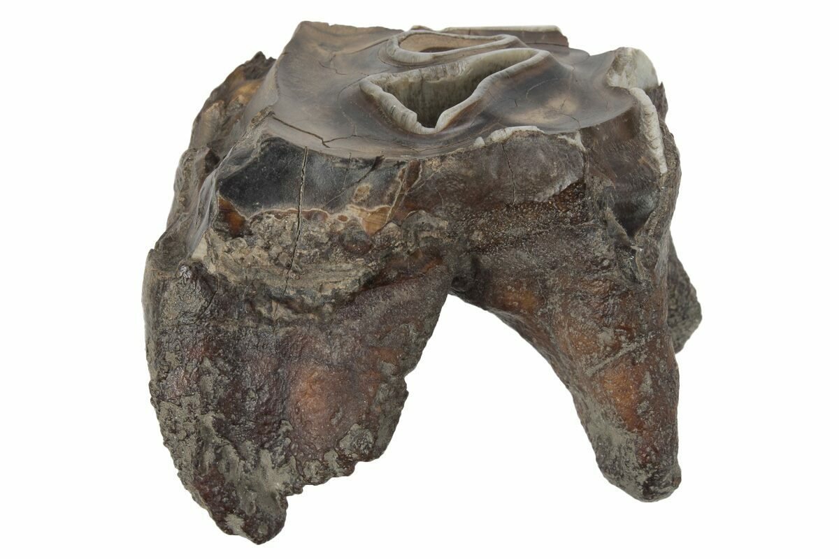 This is a fossil tooth from a woolly rhinoceros (Coelodonta antiquitatis). It comes from Siberia, Russia, where many Woolly Mammoth and Rhino fossils are unearthed. Including the root, the tooth measures 2.55" wide.