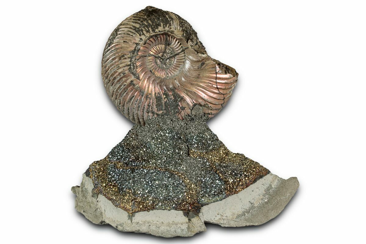This is an interesting and colorful pyritized ammonite (Quenstedticeras sp.) display. The ammonite was collected from the Middle Jurassic age deposits along the banks of the Volga River near Saratov, Russia. It has been mounted to this section of iridescent pyrite ("rainbow pyrite") encrusted rock to create this alluring display.