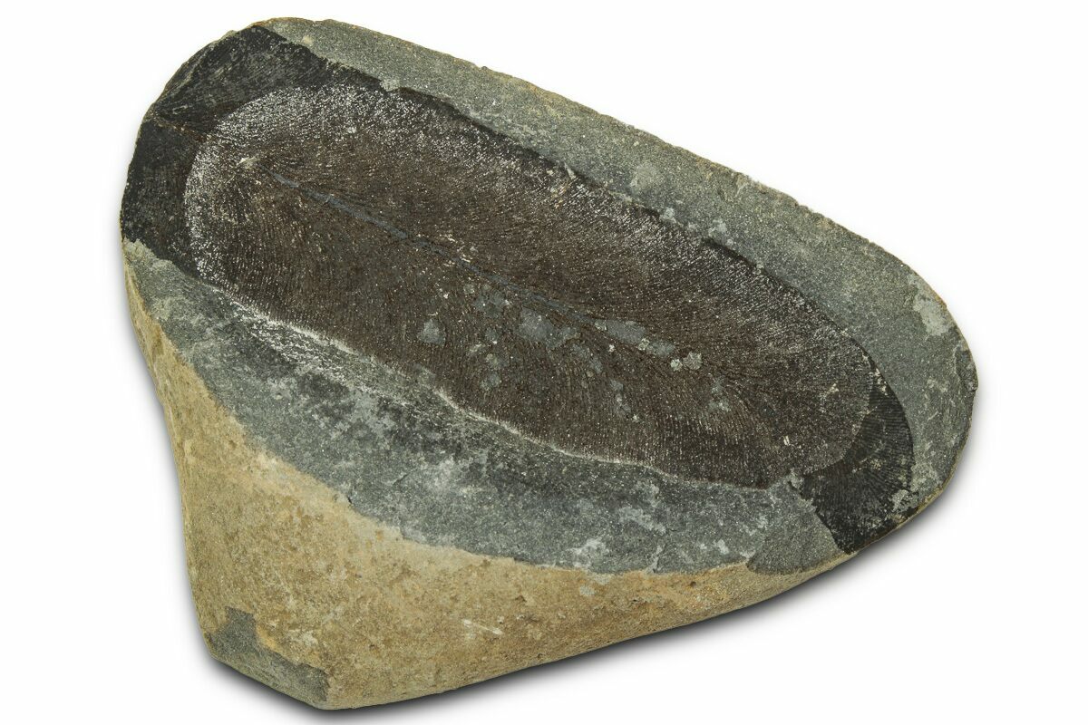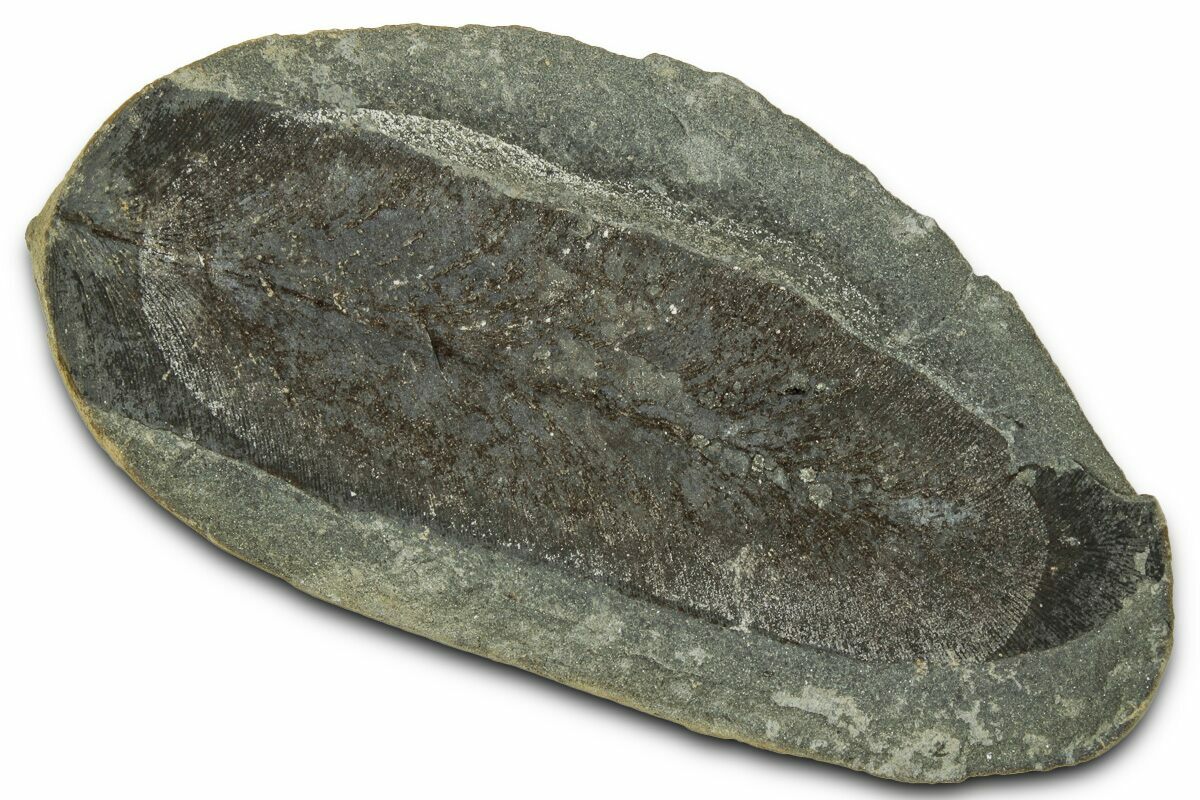 This is a nicely defined fossil leaf of the fern Macroneuropteris preserved inside an ironstone nodule that has been split open. It comes from the famous Mazon Creek Lagerstätte. These ironstone nodules have been collected for decades from the spoil heaps of abandoned coil mines near Coal City, Illinois.
