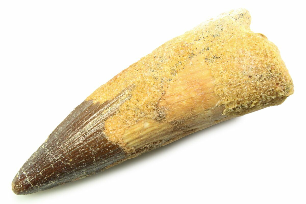 Spinosaurus teeth are relatively common fossils, but large (3+ inches), well-preserved examples are rare. These large Spinosaurus teeth will often be heavily doctored. We’ve seen many examples where multiple partial teeth can been glued to together to create a larger fake tooth, or where enamel has been painted on. One giveaway to look for is a ring of sand around the middle of the tooth, usually glued on to hide a break. Sometimes this is a sign that multiple partial teeth have been composited, but other times it is used to disguise a badly done repair job.