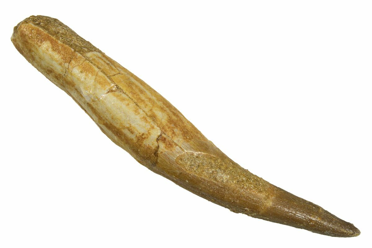 This is a 2.58" long, rooted tooth from the Cretaceous marine reptile Zarafasaura oceanis, a long-necked plesiosaur from the Oulad Abdoun Basin of Morocco. The tooth preserves nearly the entire root—a rare occurrence that indicates it was not a naturally shed tooth but one lost during the animal’s life. There are several repaired cracks along its length with some some areas of gap fill restoration.