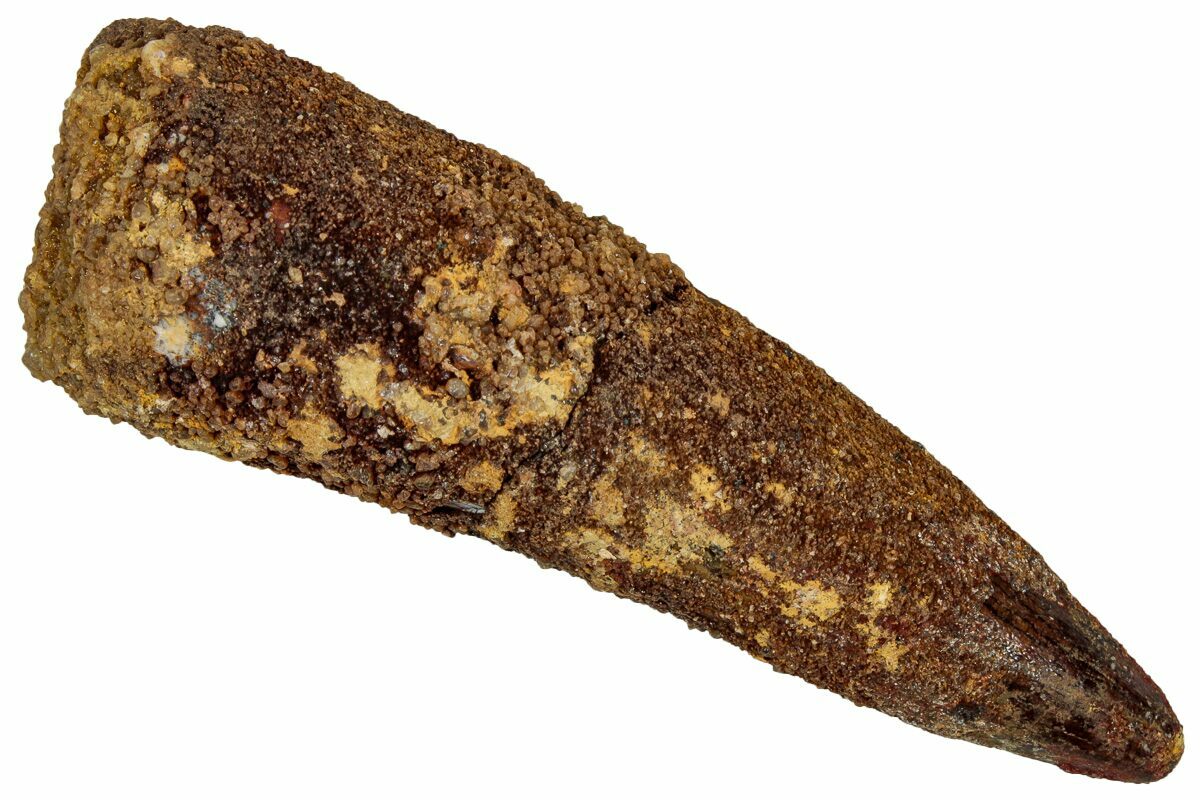 This is a 2.58" long Spinosaurus tooth from the Kem Kem Beds of Morocco. It is Late Cretaceous in age, approximately 95 million years old.