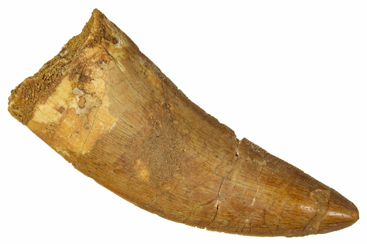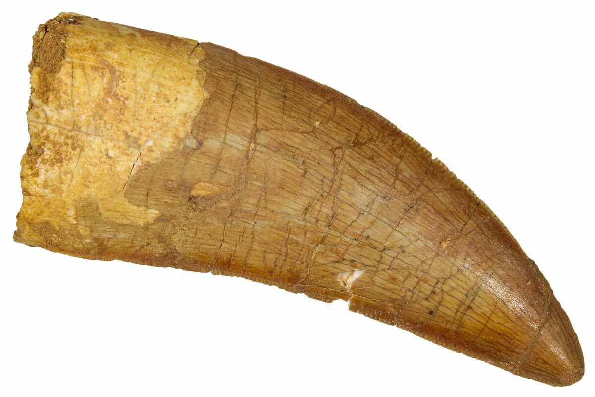 This is a good-sized, serrated, 2.58" long tooth of a Carcharodontosaurus from the Late Cretaceous Kem Kem Beds of Morocco. Carcharodontosaurus was a massive predatory dinosaur larger than Tyrannosaurus rex.
