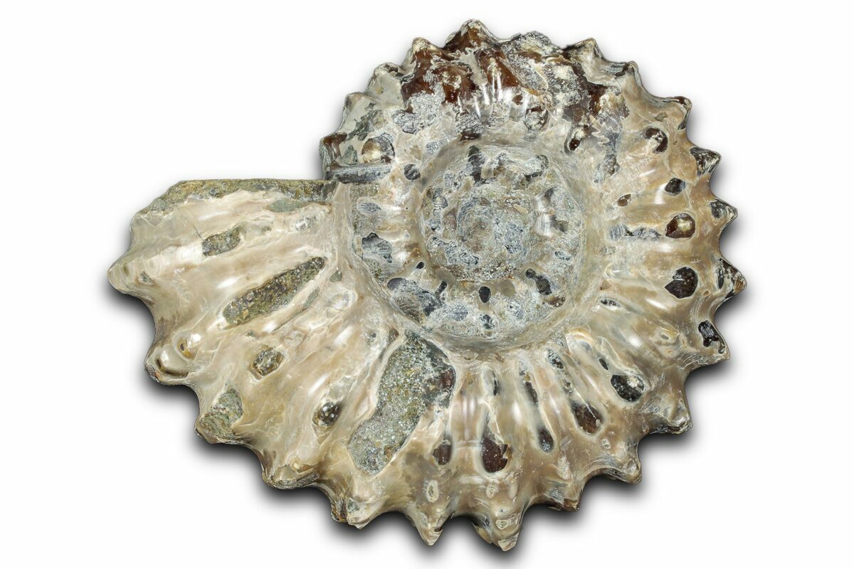 Ammonites were ancient marine cephalopods, similar to today's squids and octopuses, but with a defining feature: their distinctive, tightly coiled spiral shells. These shells, resembling those of modern nautiluses, served as both a protective home and a buoyancy aid, allowing ammonites to navigate the prehistoric seas with ease. First emerging around 240 million years ago in the Triassic Period, ammonites thrived for over 175 million years, adapting through numerous forms and sizes. As predatory creatures, they likely fed on smaller marine organisms, using their tentacles to capture prey. However, their long reign came to an end 65 million years ago at the close of the Cretaceous, coinciding with the mass extinction event that also eliminated the dinosaurs.
