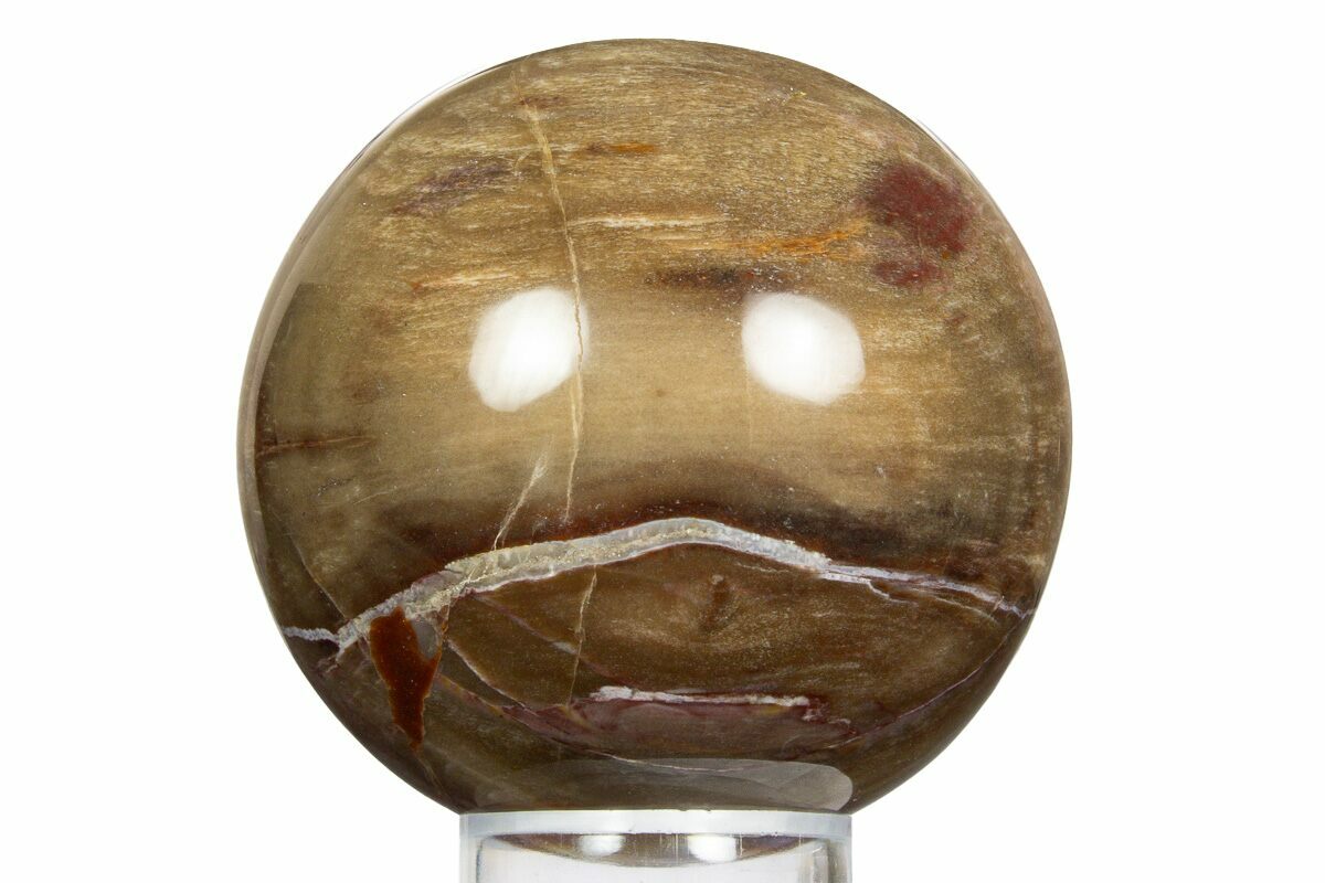 This is a colorful, 2.6" wide polished sphere of petrified wood from Ambilobe, Madagascar. It is from the Araucaria tree, a type of conifer. The petrified wood is from the early Triassic period, approximately 220 million years old, close to the time the first dinosaurs appeared on the planet.