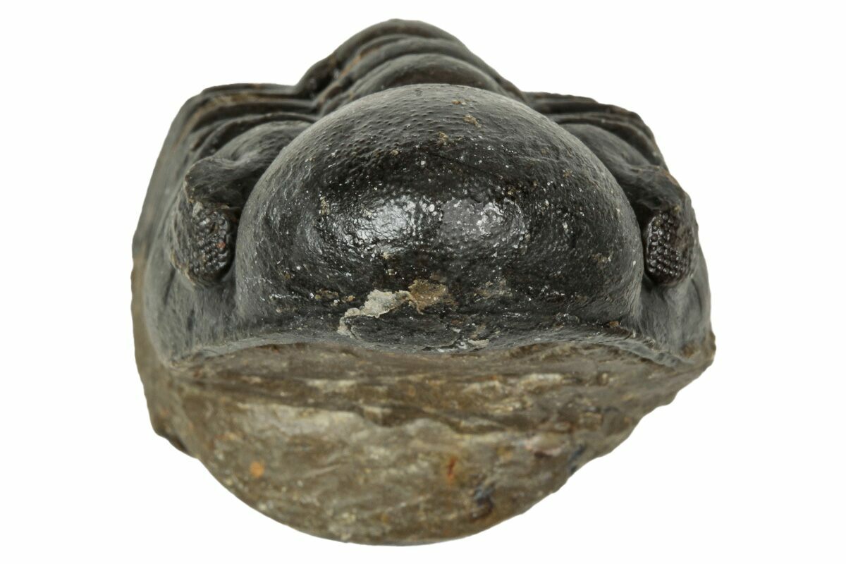 This is a 2.6" long, curled Reedops trilobite collected near Atchana, Morocco. It has a lot of surface detail including, visible, preserved eye facets in its eyes.