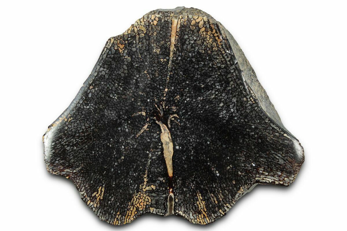 The vertebra has been cut in half and polished to a glossy finish to reveal the intricate, mineral replaced bone cells. Comes with an acrylic display stand. Only the pictured half of the vertebra is included.