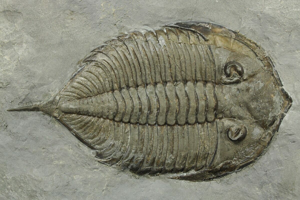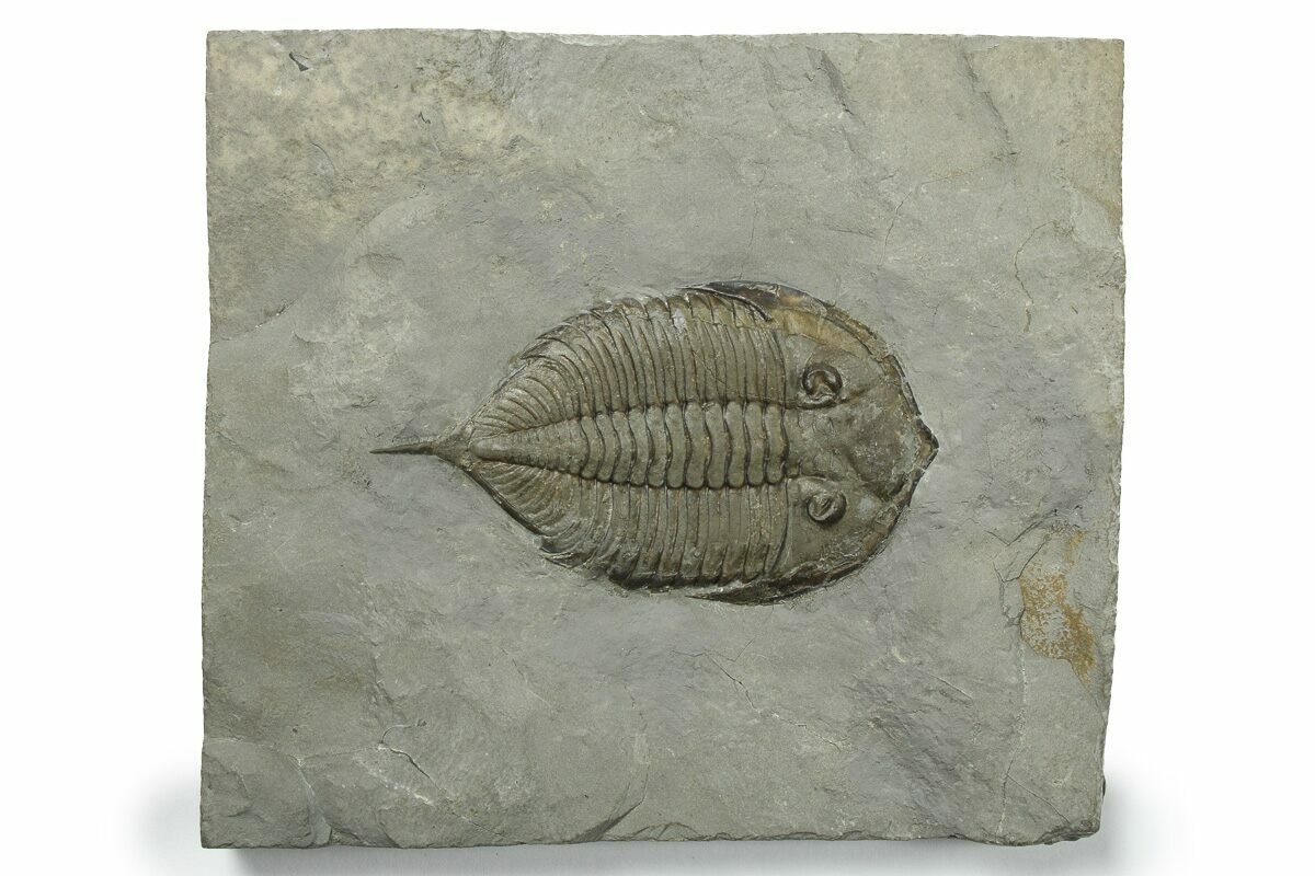 This is a 2.6" long specimen of the classic New York, Silurian trilobite Dalmanites limulurus. It was collected from the famous Caleb's Quarry near Middleport, NY. The tail spine on this specimen has been restored.