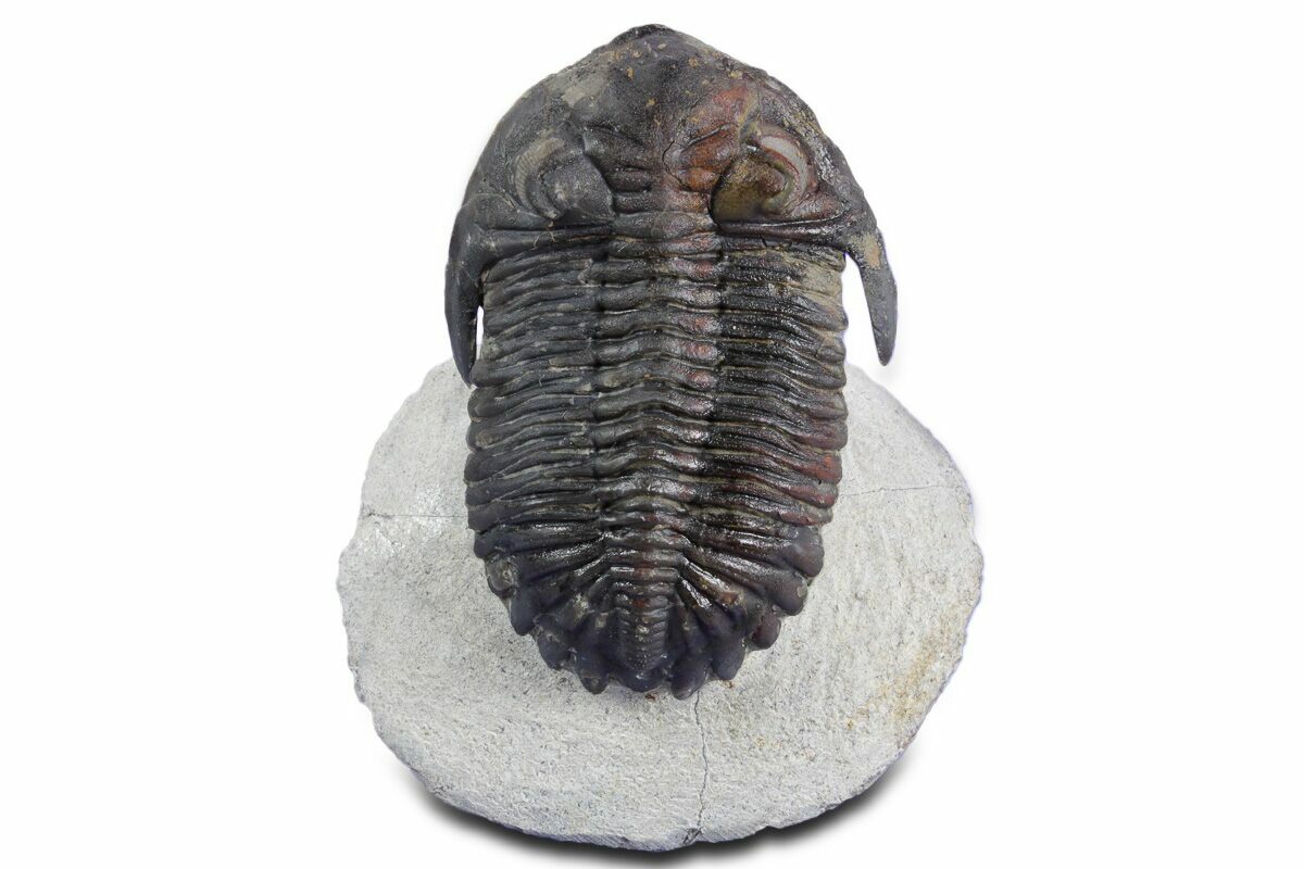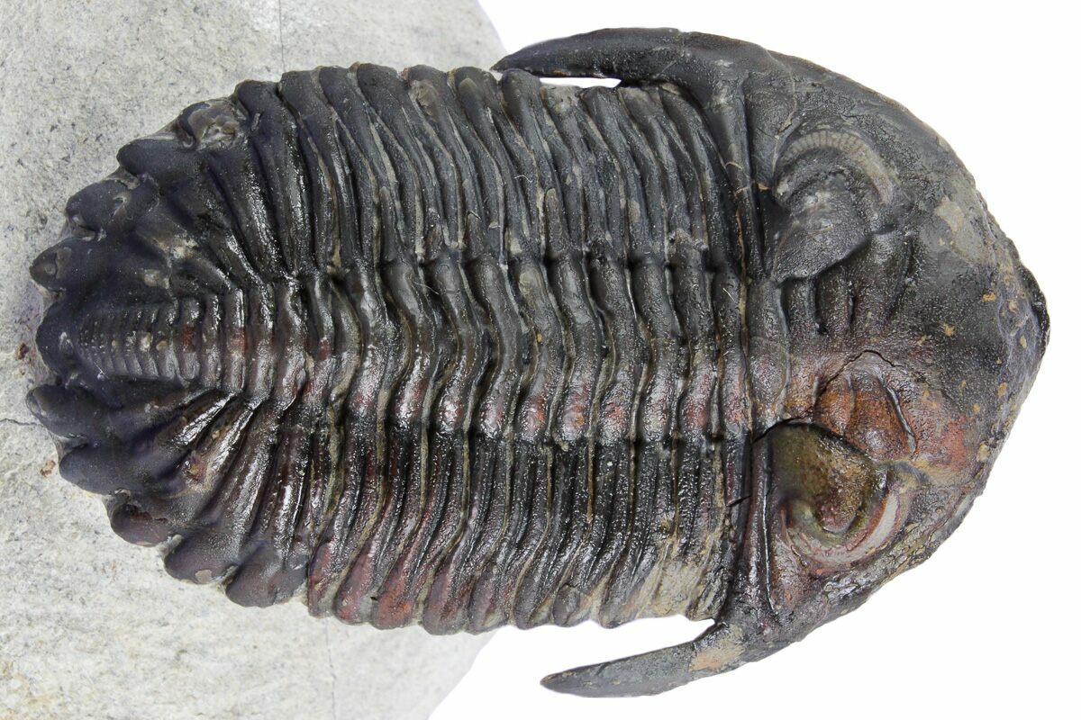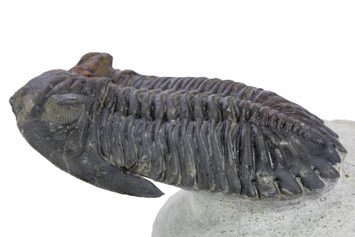 This is a detailed, 2.6" long Hollardops trilobite fossil from Ofaten, Morocco. Nearly all of the limestone has been carefully removed surrounding it, leaving it "flying" above the rock. It has preserved eye facets in both eyes there is about 5% shell restoration in total.