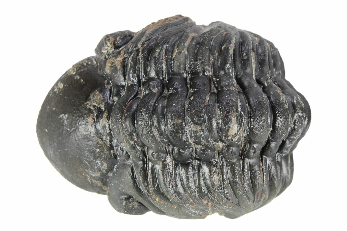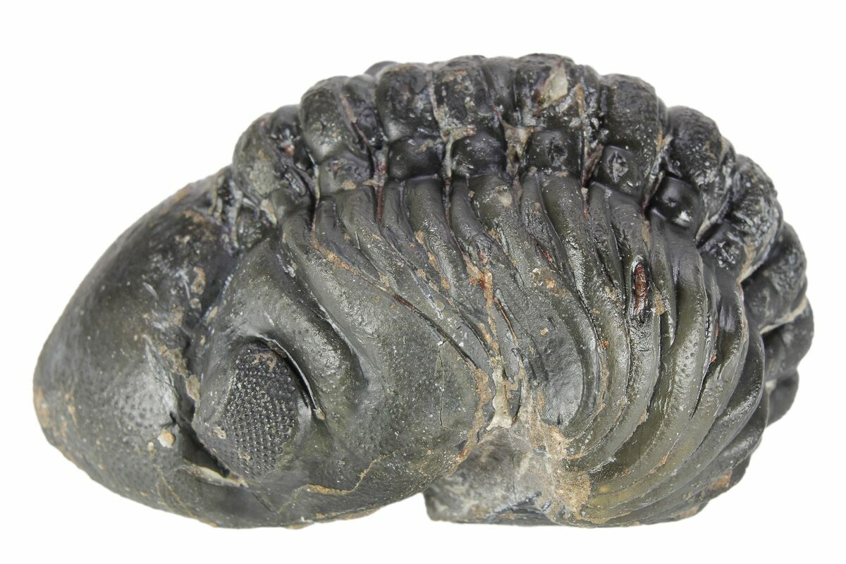 This is an enrolled, 2.6" long (if outstretched), partially enrolled Reedops trilobite collected near Atchana, Morocco. It has a lot of surface detail including, visible, preserved eye facets in it's eyes.