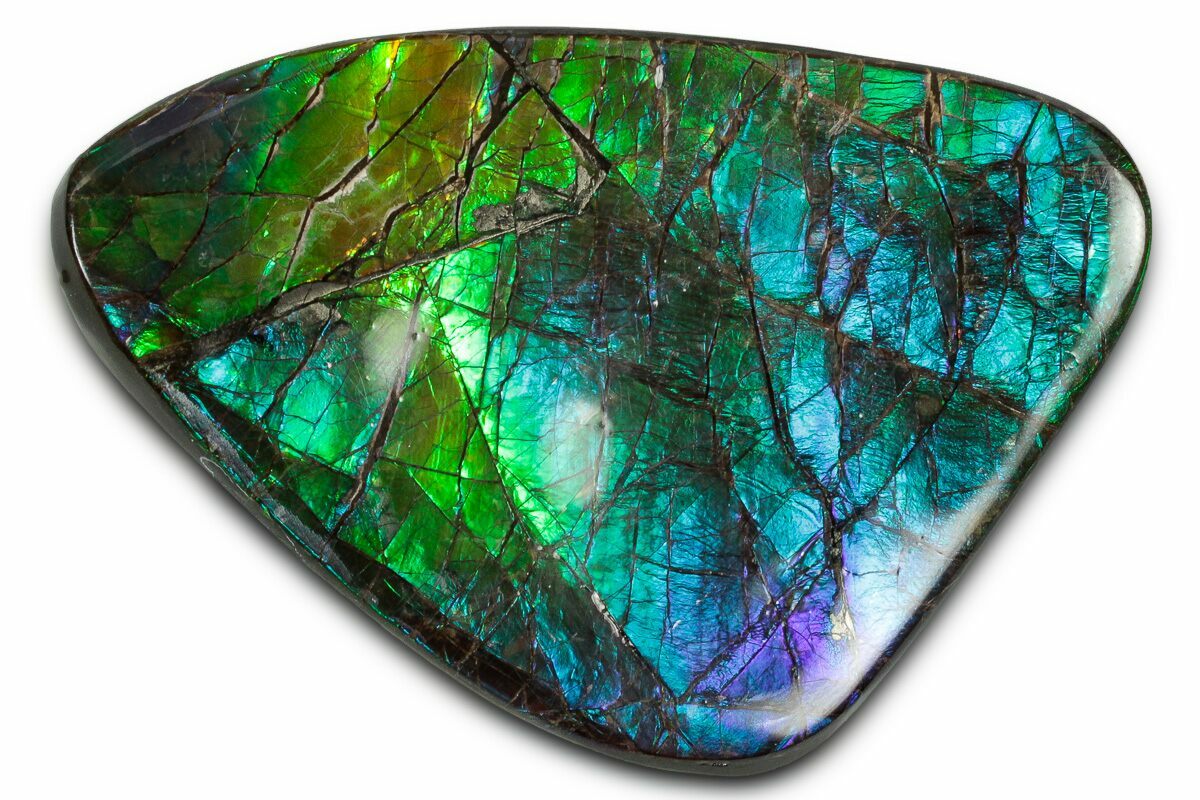 Ammolite is an opal-like gemstone found primarily in Alberta, Canada. It is a kind of fossilized shell from ammonites, which in turn are composed primarily of aragonite, the same mineral contained in nacre (mother-of-pearl). The shell's microstructures are often preserved. In 1981, ammolite was given official gemstone status by the World Jewellery Confederation (CIBJO).