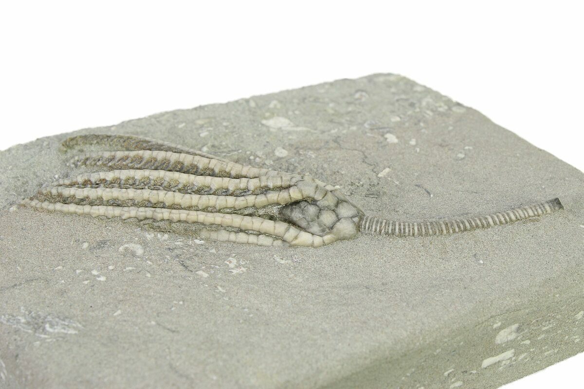 This is a Histocrinus coreyi crinoid from the Edwardsville Formation of Crawfordsville, Indiana. The quality of preparation on this fossil is exquisite, using skillful air-abrasion techniques under a stereo microscope. The measurement of the crinoid including its stem, is 2.6" long.