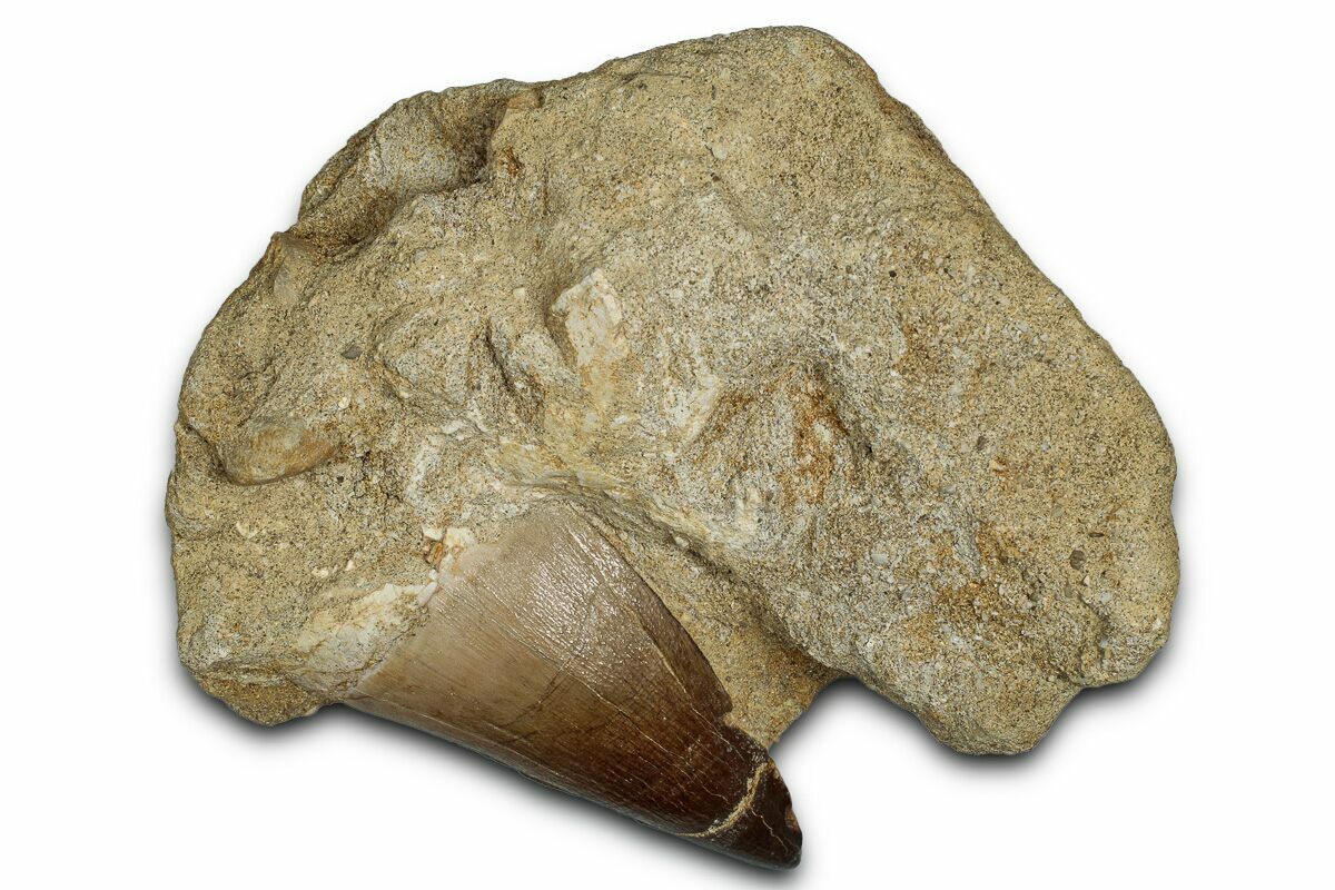 2.6" Fossil Mosasaur (Thalassotitan) Tooth in Rock - Morocco