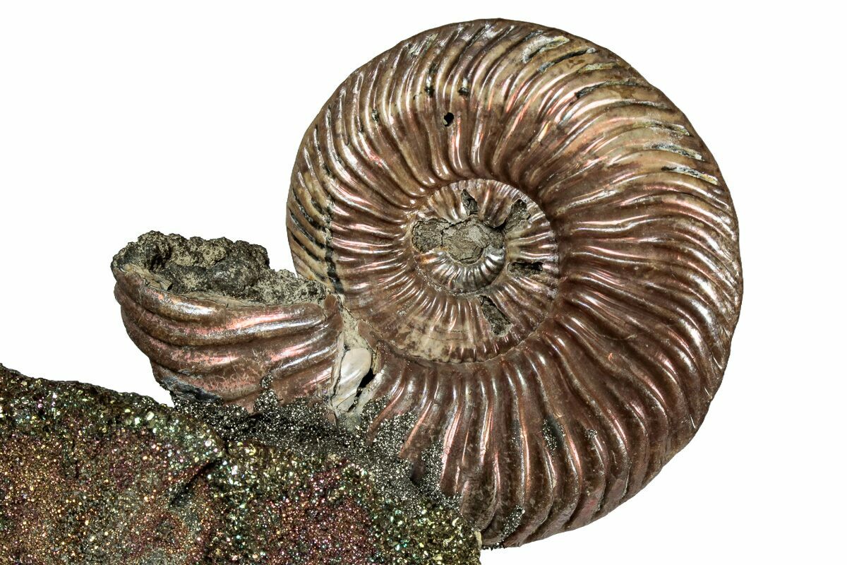 This is an interesting and colorful pyritized ammonite (Quenstedticeras sp.) display. The ammonite was collected from the Middle Jurassic age deposits along the banks of the Volga River near Saratov, Russia. It has been mounted to this section of iridescent pyrite ("rainbow pyrite") encrusted rock to create this alluring display.