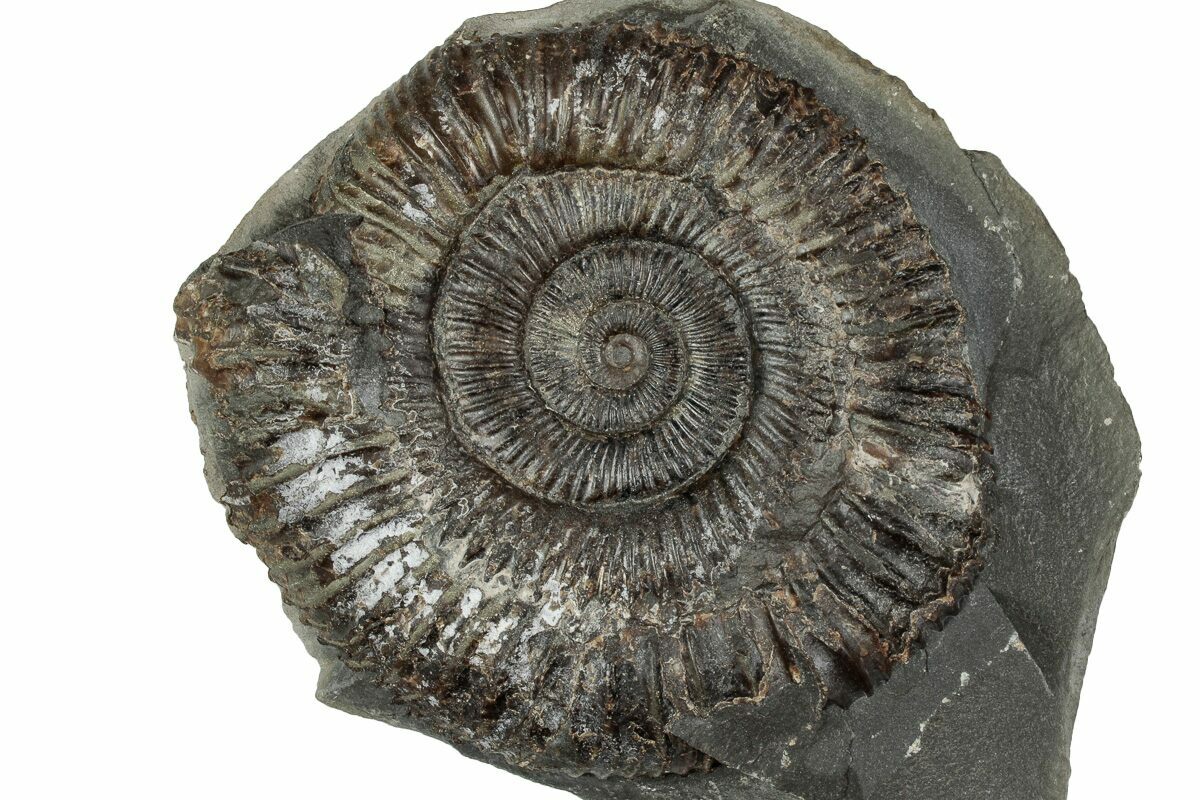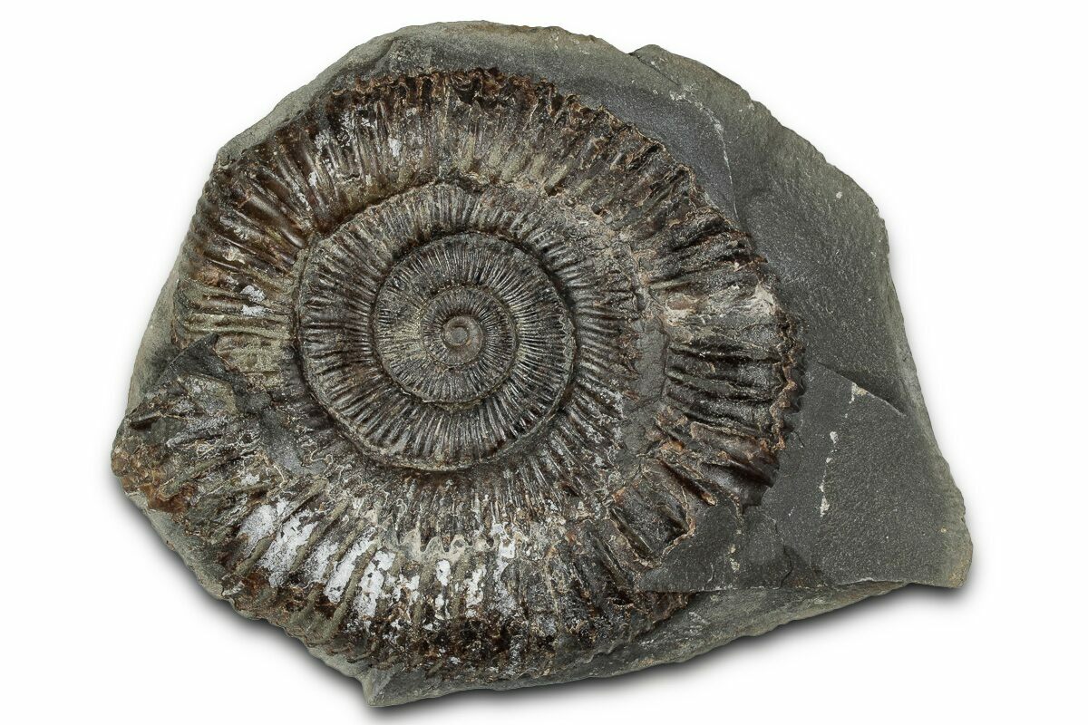 This is a classic British ammonite of the species Dactylioceras commune. These well preserved ammonites are Jurassic in age and are found in hard concretions that must be split open to reveal the fossil. The hard rock then has to be removed mechanically to further expose the fossil.