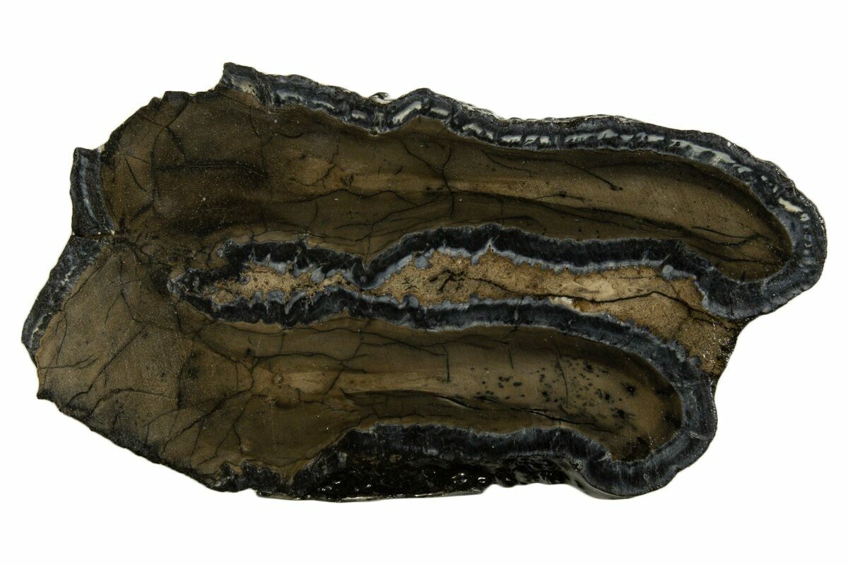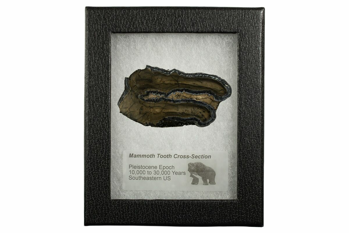 This is a interesting, cross-sectional slice of a Columbia Mammoth (Mammuthus columbi) molar collected from the coastal region of South Carolina. It comes with a riker mount display case.