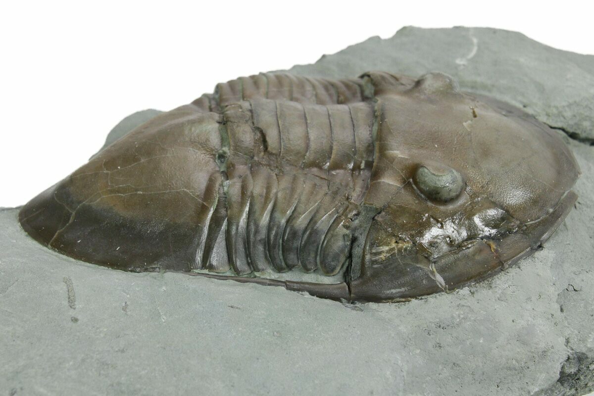 This is a nice, prone 2.6" long Isotelus maximus from the famous Mt. Orab, Ohio trilobite locality. Isotelus maximus is the state fossil of Ohio. There is no restoration on the fossil itself.