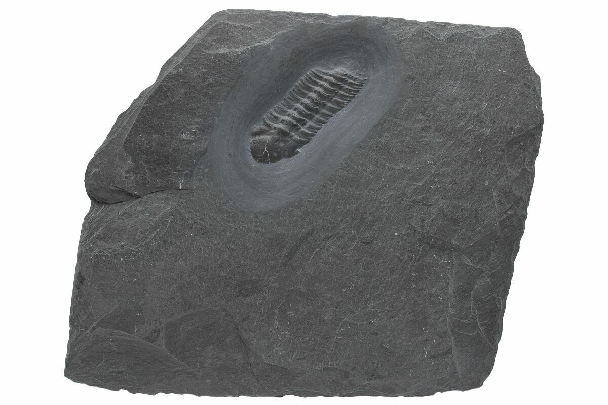 This is a 2.6" long, pyritized trilobite (Chotecops ferdinandi) from the Hunsrück Slate of Germany. It has been prepped to display the trilobite in prone fashion. The thin underside of the trilobite has been stabilized with epoxy on the opposite side of the plate.