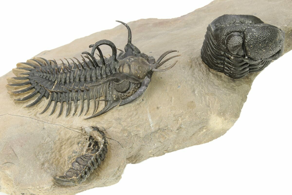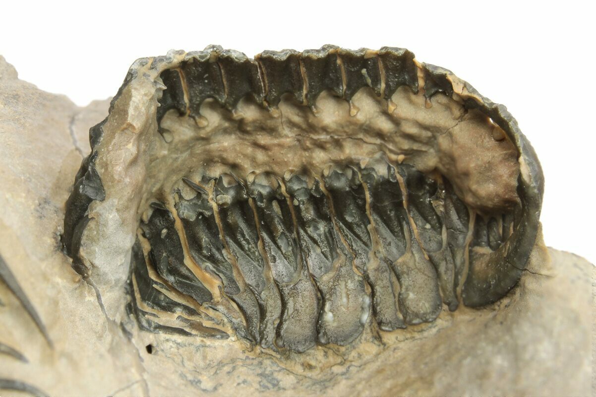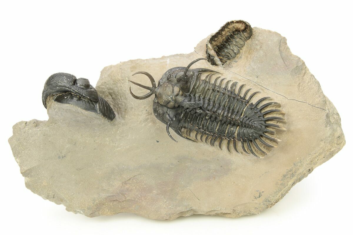 At over 2 1/2" long this specimen is huge for the species. It has excellent preservation and preparation with less that 1% restoration. There are also two partial Morocops trilobites present on the piece.