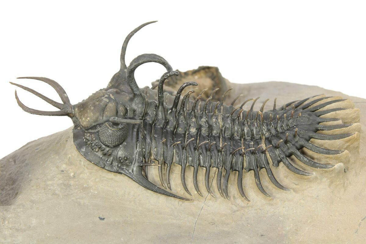 This is a large, 2.6" long specimen of the spiny trilobite Walliserops hammi, often referred to at the "short trident" Walliserops. Walliserops hammi was typically much smaller than the long-forked Walliserops trifurcatus found at the same location. It is also much rarer. These trilobites take a long time to prepare due to the 40+ free standing spines along their back.