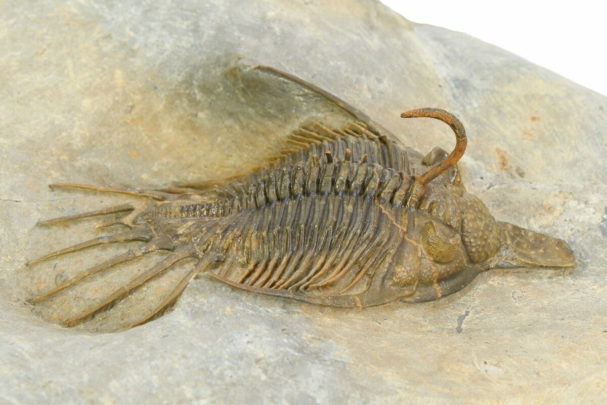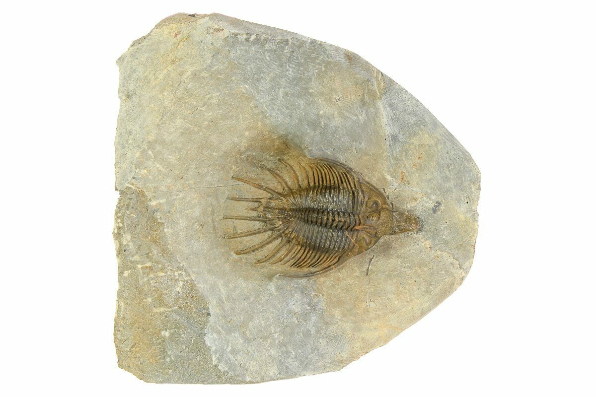This is an interesting, 2.6" long, spiny Psychopyge trilobite from Ofaten, Morocco. The specimen has a natural, multi-toned shell coloration and lots of tiny, free-standing spines. The preparation is excellent and it has no restoration. This one appears very similar to Psychopyge hammerorum.