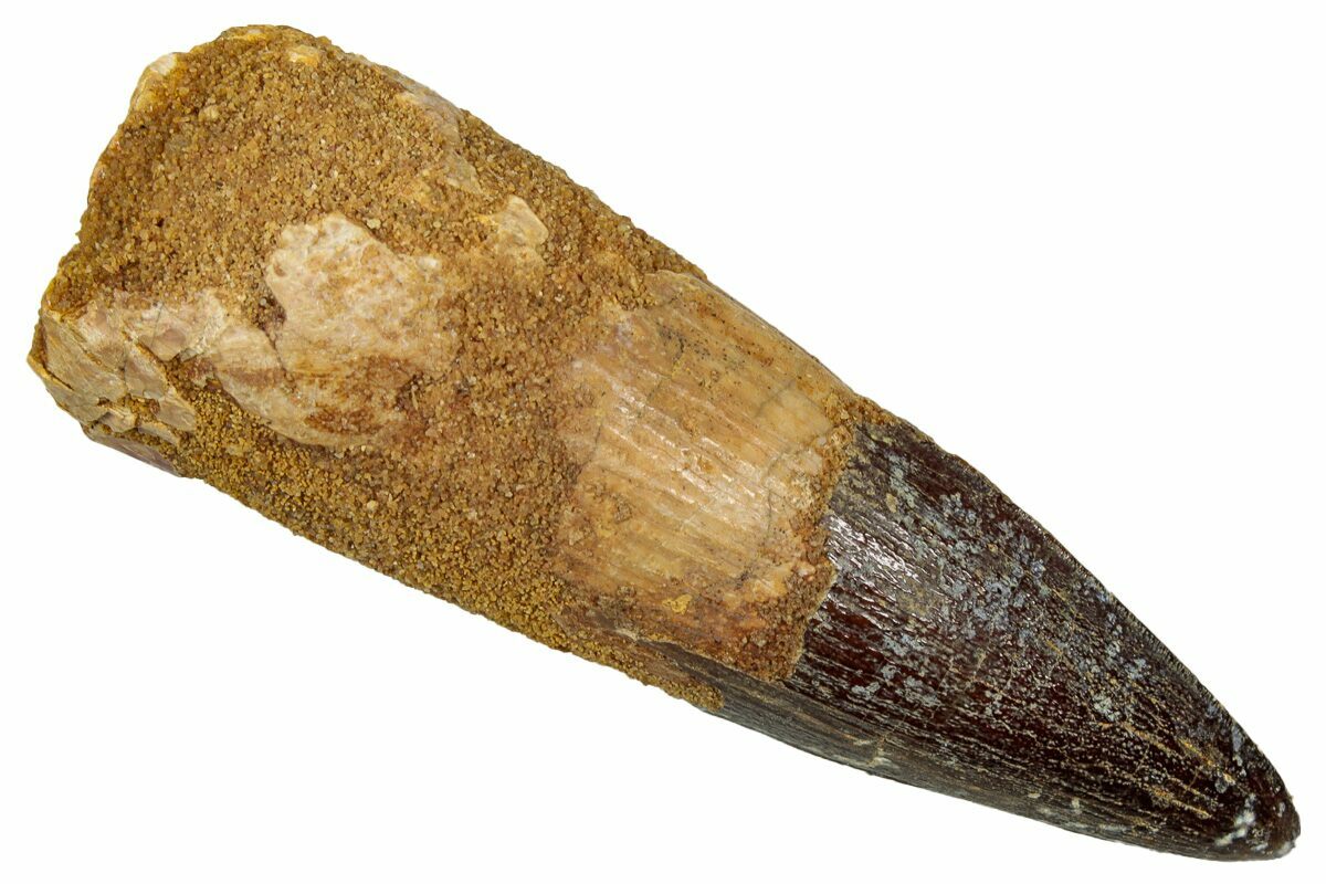 This is a 2.60" long Spinosaurus tooth from the Kem Kem Beds of Morocco. It is Late Cretaceous in age, approximately 95 million years old.