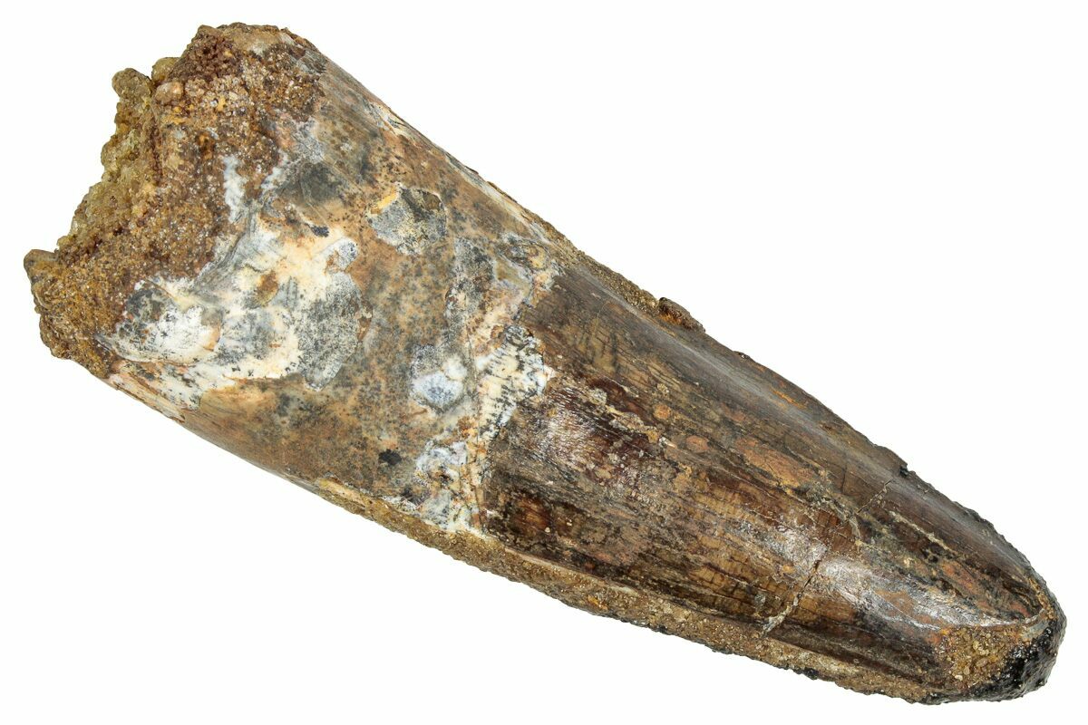 This is a 2.60" long Spinosaurus tooth from the Kem Kem Beds of Morocco. It is Late Cretaceous in age, approximately 95 million years old.