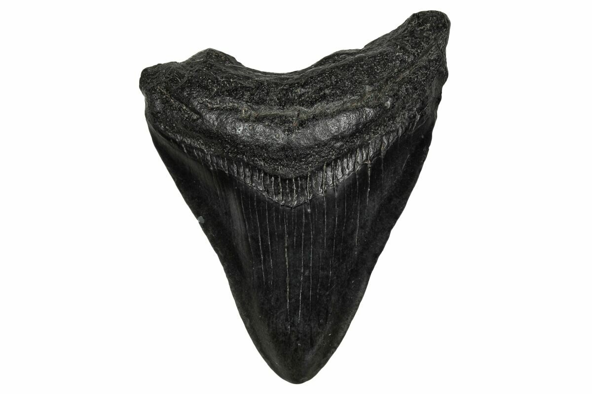 The standard measure for megalodon teeth is slant height, or the longest edge of the tooth. Adult megalodon teeth were typically in the 4 to 5 inch range: teeth over 6 inches are rare and represent super-sized individuals. Only a handful of teeth have ever been found over seven inches.