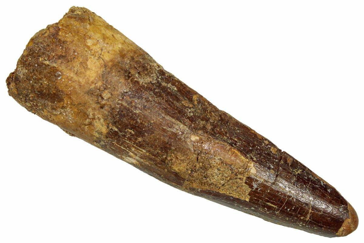 This is a 2.61" long Spinosaurus tooth from the Kem Kem Beds of Morocco. It is Late Cretaceous in age, approximately 95 million years old.