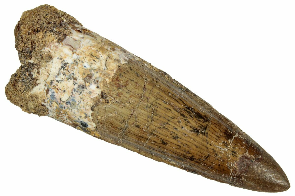 This is a 2.61" long Spinosaurus tooth from the Kem Kem Beds of Morocco. It is Late Cretaceous in age, approximately 95 million years old.