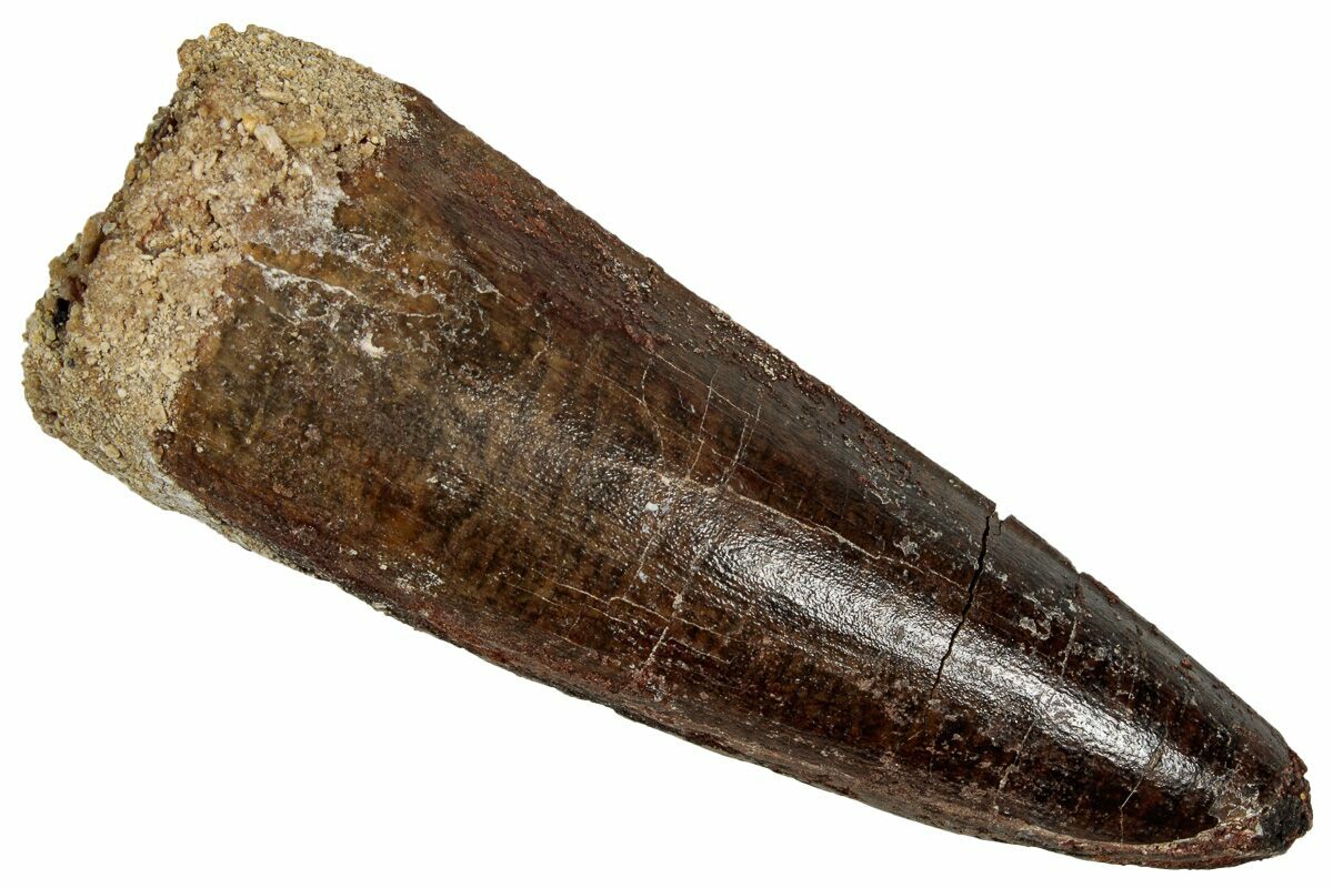 This is a 2.61" long Spinosaurus tooth from the Kem Kem Beds of Morocco. It is Late Cretaceous in age, approximately 95 million years old.