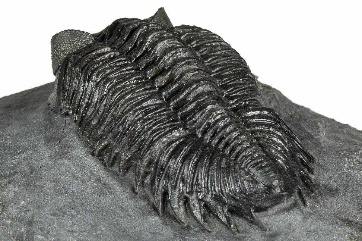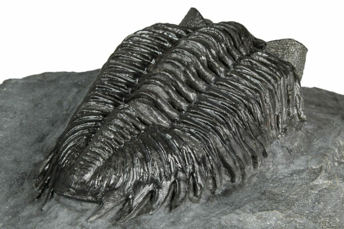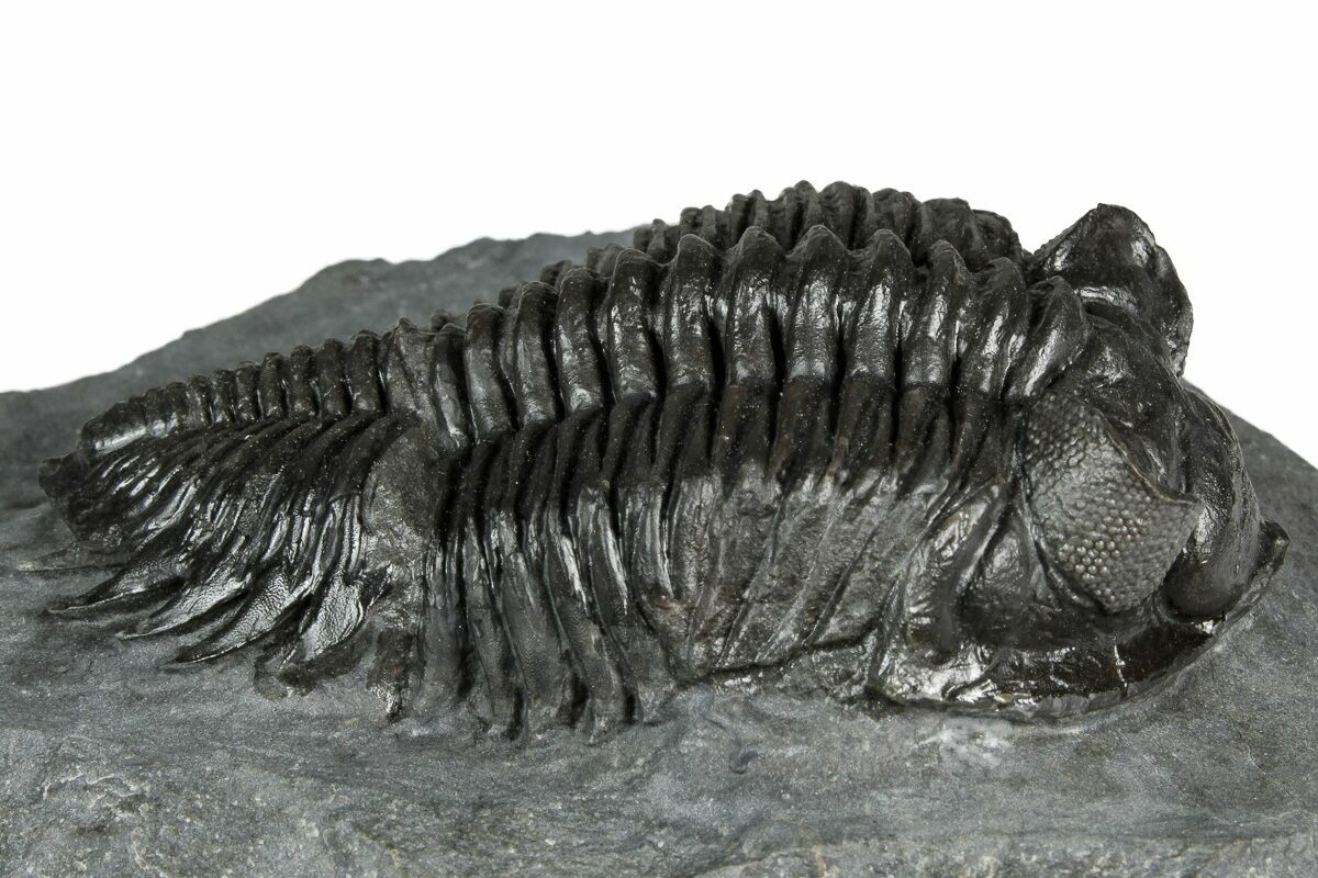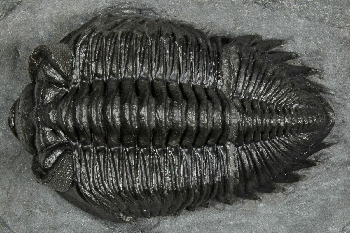 This is a detailed, 2.65" long, Coltraneia trilobite with amazing "tower eyes" full of hundreds of eye facets. The genus has often been referred to as Treveropyge in the past. It was quarried at Ofaten Mountain, Morocco.